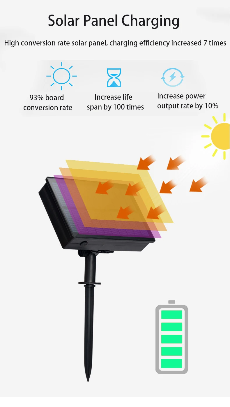 Этот Солнечный струнный светильник оснащен высококачественными полисиликоновыми солнечными панелями, которые имеют более высокий коэффициент конверсии электрической энергии и более высокую скорость зарядки, которая в 7 раз превышает скорость зарядки обычных солнечных панелей.