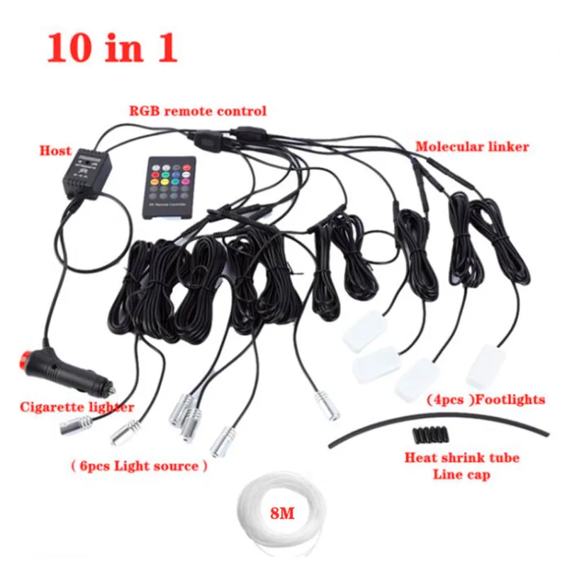Универсальная Светодиодная лента 10 в 1 RGB с 8 м для внутренней отделки автомобиля, волоконно-оптическая светильник та с управлением через приложение, декоративные атмосферные лампы 12 В