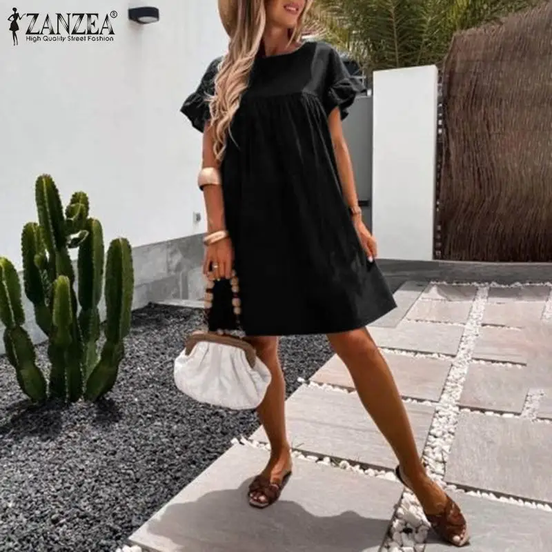 Платье ZANZEA женское с оборками, стильный ажурный Повседневный однотонный Мини Сарафан с коротким рукавом, лето 2021