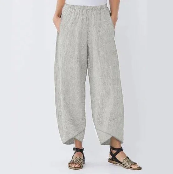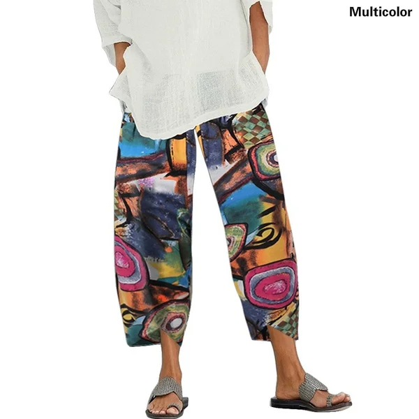 Женские винтажные шаровары, из хлопка и льна, свободные, с принтом, с эластичной талией, летние, асимметричные, укороченные