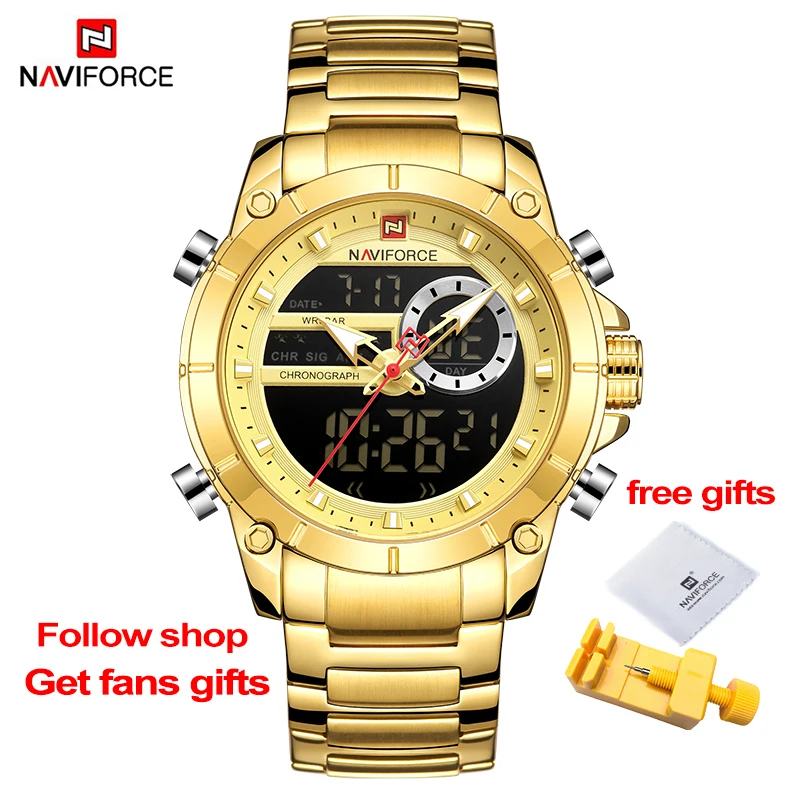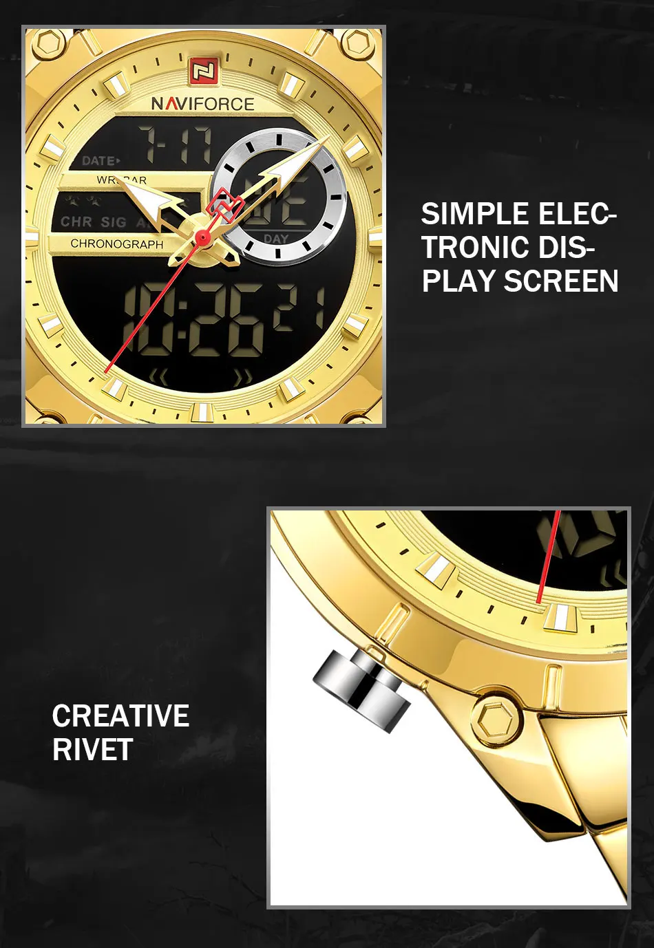 Часы NAVIFORCE мужские золотые, спортивные, водонепроницаемые, с двойным хронографом, из нержавеющей стали