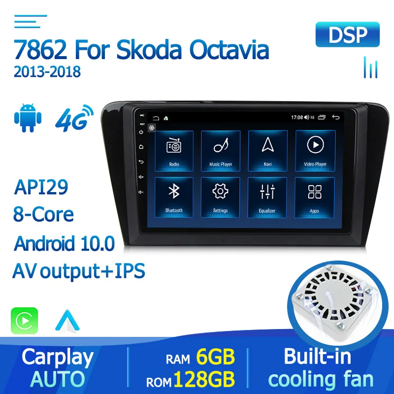 Головное устройство на Android 10, 6 + 128 ГБ, автомобильное радио, мультимедийный плеер, навигация GPS для Volkswagen SKODA Octavia 3 A7 2013-2018 с вентилятором BT