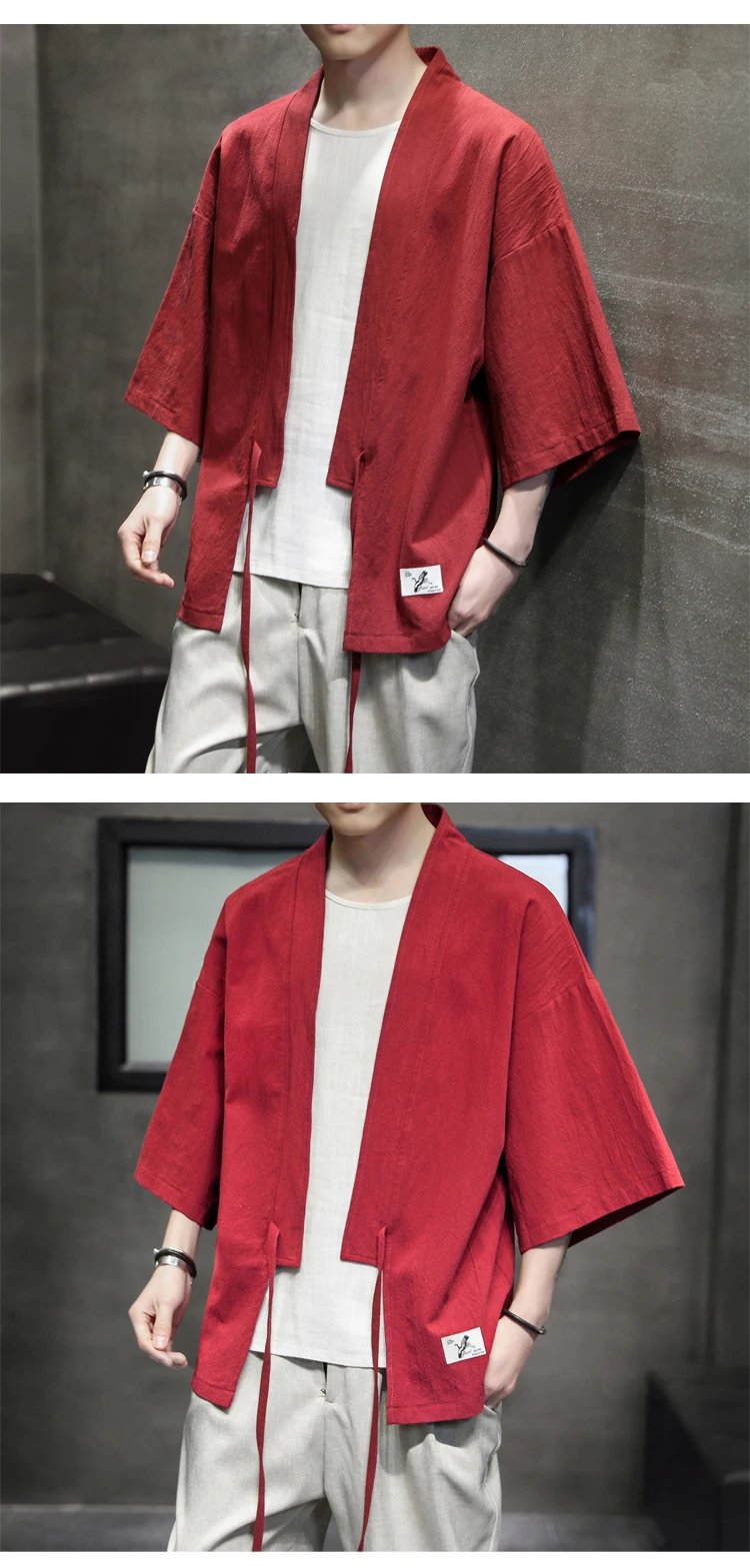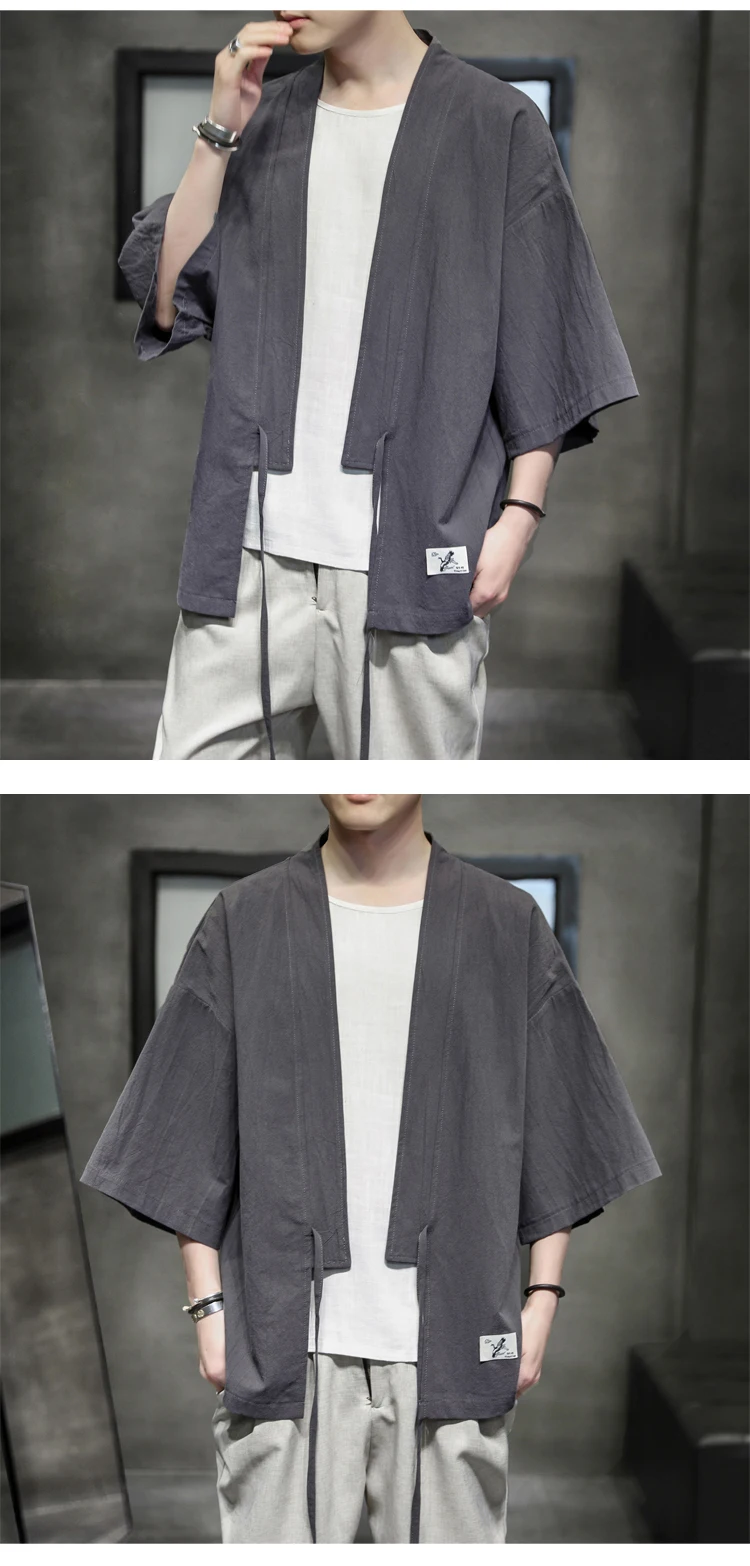 M-5XL Мужская рубашка в японском стиле, однотонная Ретро рубашка ханфу с рукавом до локтя, размера плюс, винтажная Мужская рубашка без воротника, s кимоно 4XL, 2021