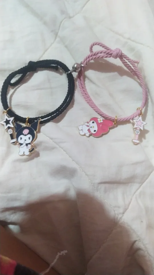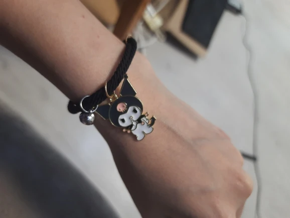 Материал очень приятный, все фигурки на месте, но чёрный браслет меньше розового, у меня большое запястье и думаю, что другим это не проблема. Очень довольна браслетами.