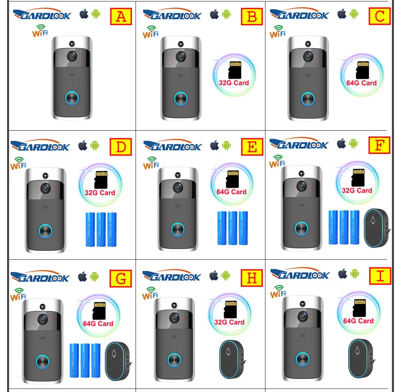 Примечание: Для видеоузла Wi-Fi используется перезаряжаемая батарея 18650, 3 шт. Беспроводной дверной звонок поддерживает вилку стандарта ЕС/США/Великобритании (опционально).О: 1 * Видеозвонок WiFi (хост)B:1 * хост + 1*32G картаC:1 * хост + 1*64G картаD:1 * хост + 1*32G карта + 3 * батареиE:1 * хост + 1*64G карта + 3 * батареиF:1 * хост + 1*32G карта + 3 * батареи + 1 * ЗвонокG:1 * хост + 1*64G карта + 3 * батареи + 1 * ЗвонокH:1 * хост + 1*32G карта + 1 * ЗвонокI:1 * хост + 1*64G карта + 1 * Звонок
