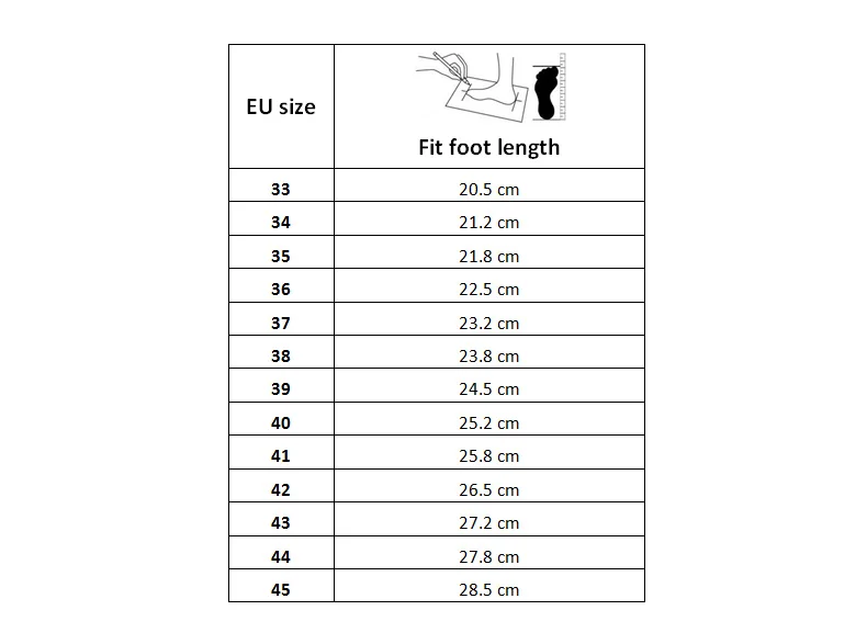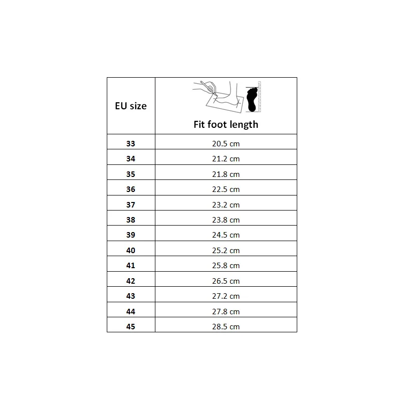 Длина стопы в таблице определяется в соответствии с размерами ноги. Если вы сомневаетесь в подтверждении размера, свяжитесь с нами, отправив сообщение.