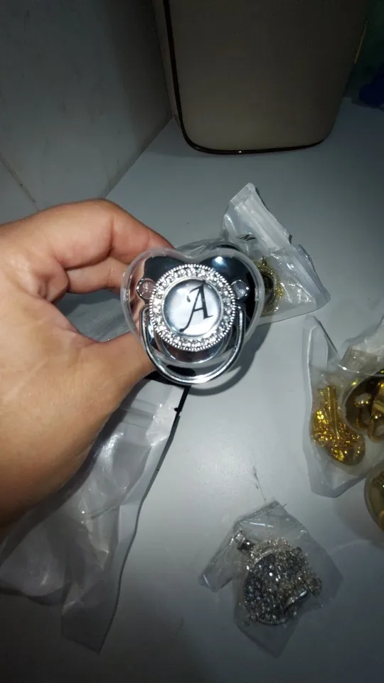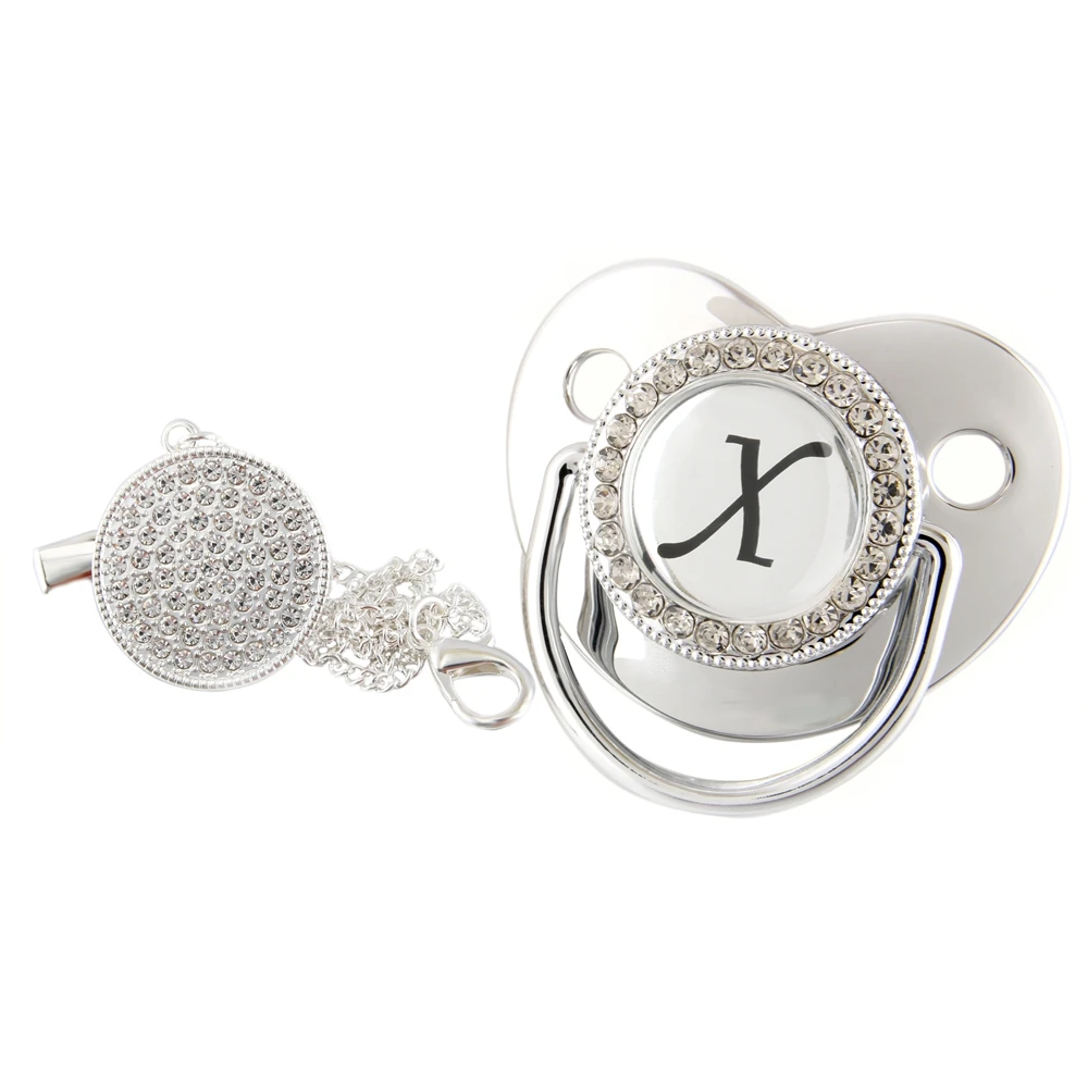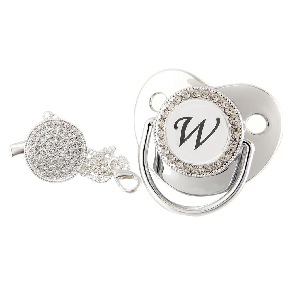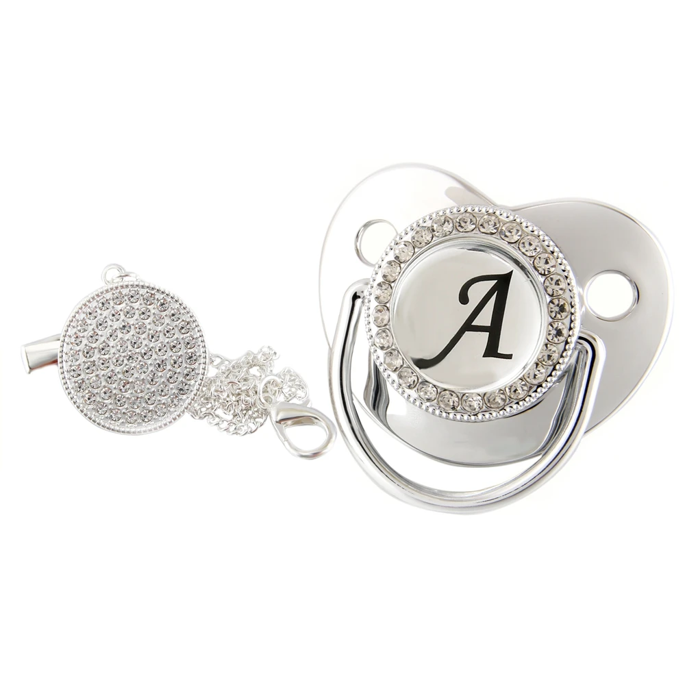 Новинка, стразы, серебряная Детская Соска с зажимом, цепочка, 26 букв, силиконовая соска для младенцев, подарок для детского душа, BPA, пустышка, пустышка
