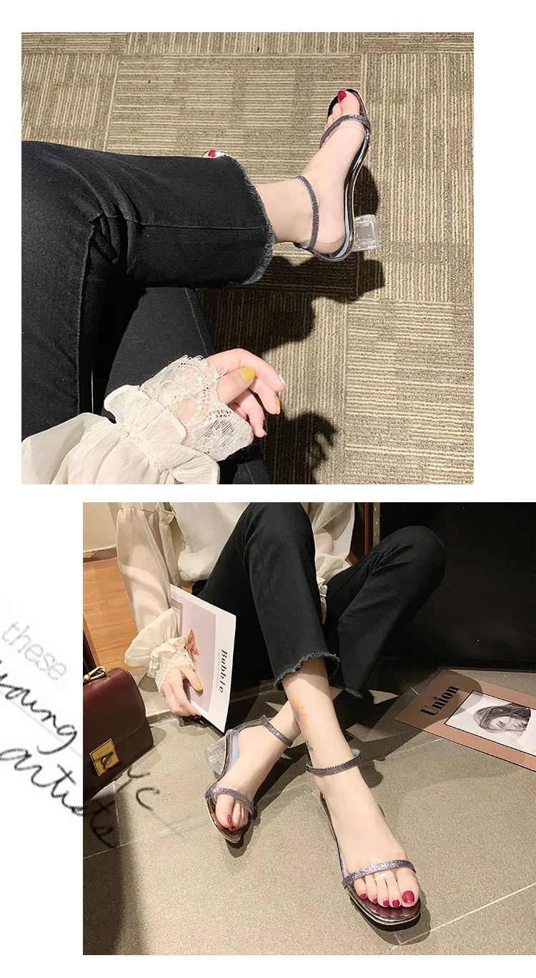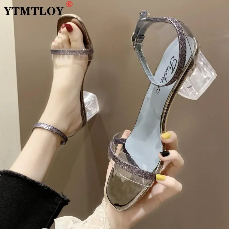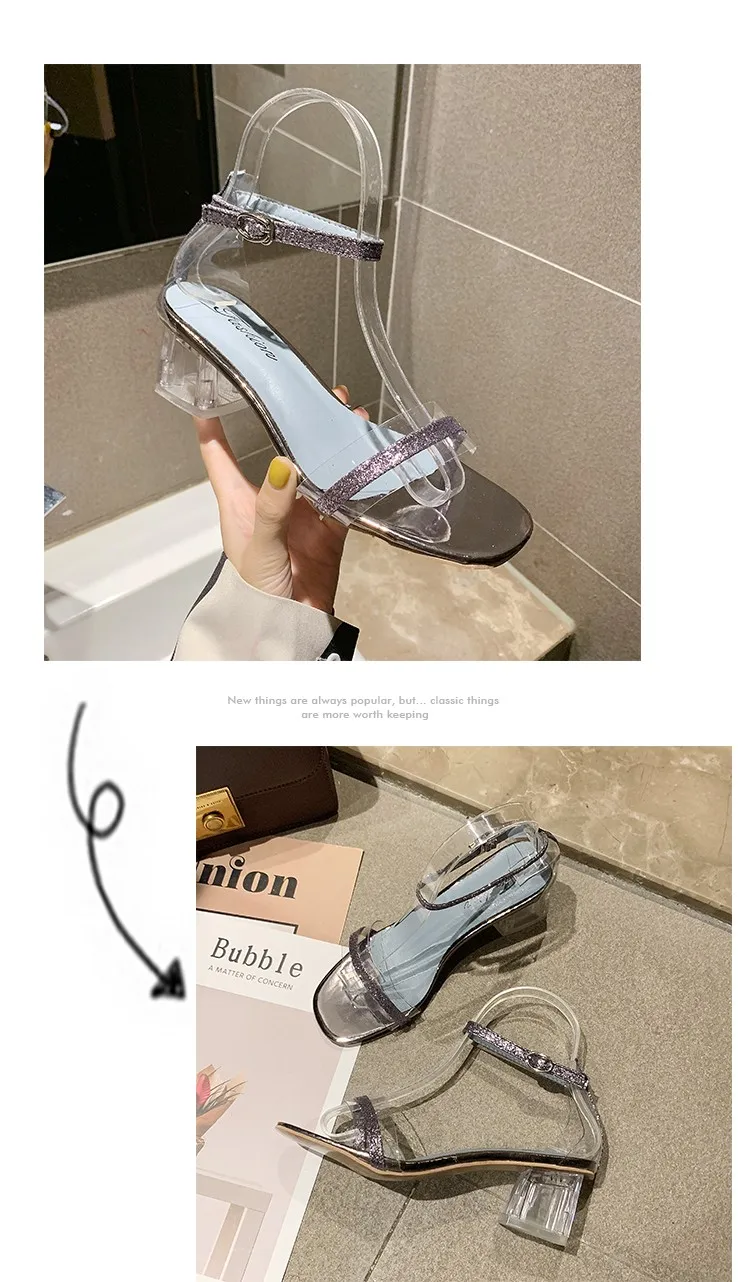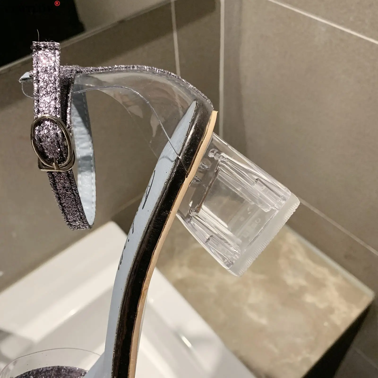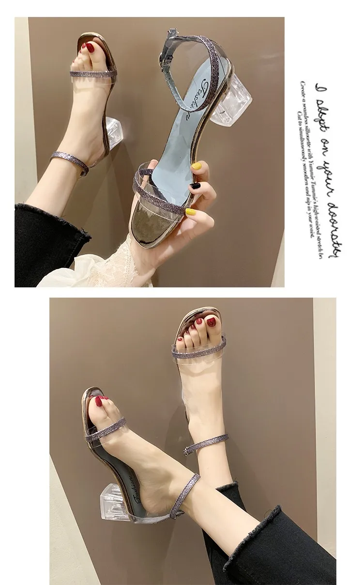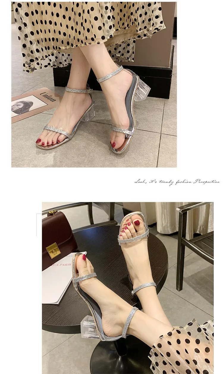 Сандалии женские прозрачные, высокий каблук, ПВХ, ремешок на щиколотке, квадратный каблук, туфли-лодочки, обувь для свадьбы