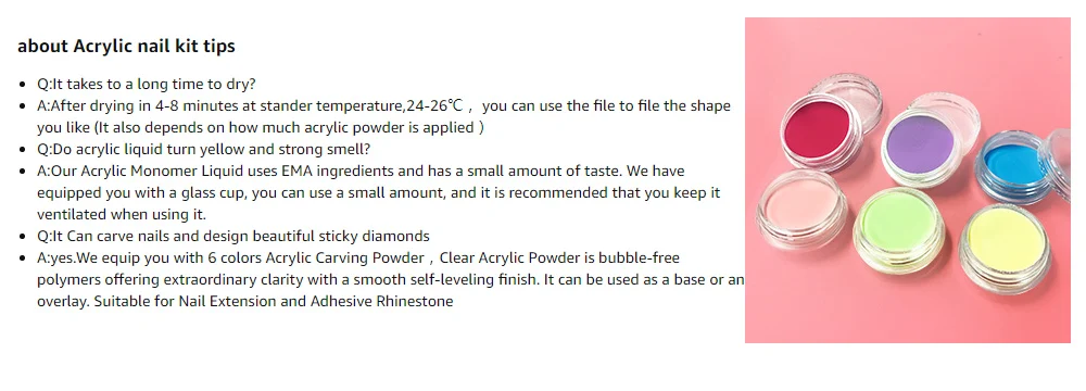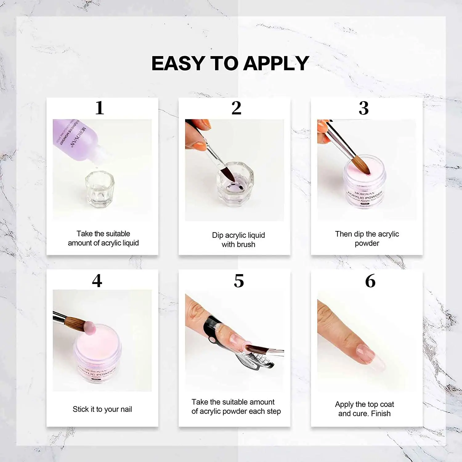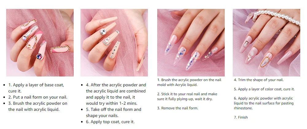 Белая акриловая пудра: подходит для ногтей и французских ногтейРозовая акриловая пудра: подходит для наращивания ногтей, обеспечивает фантастический естественный вид ваших ногтейПрозрачная акриловая пудра: подходит для наращивания ногтей и клейкой СтразыТри типа высококачественной акриловой кисти для ногтей специально разработаны для акриловой пудры для ежедневного дизайна ногтей, а пилки для ногтей обеспечивают идеальную дизайнерскую основу для дизайна ногтей