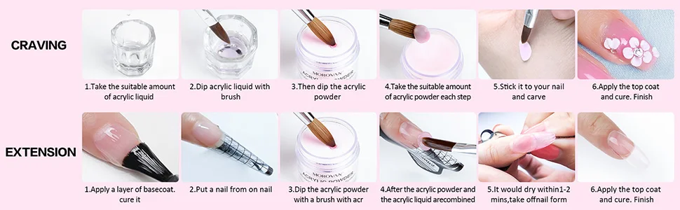 Вы получите три вида акриловых порошков для ногтей на выбор (акриловая розовая пудра, акриловая белая пудра, акриловая прозрачная пудра) и 6 цветных акриловых порошков для резьбы.Используйте с акриловым жидким мономером, не стесняйтесь наслаждаться путешествием по акриловым ногтям в этом наборе для акриловых ногтей.