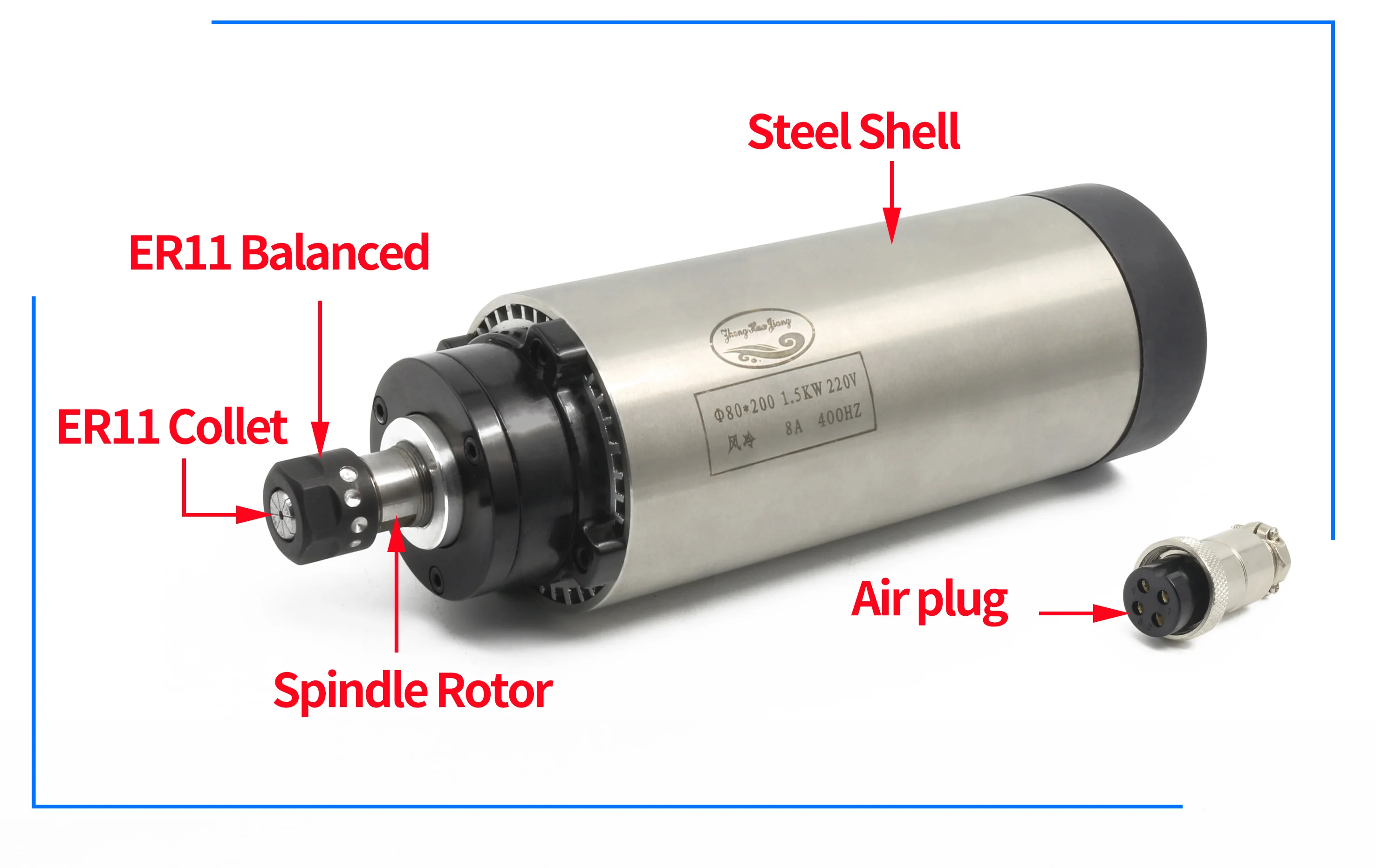 1x1,5 кВт шпиндель с воздушным охлаждением(ER11, 220 В, 400 Гц, 24000 об/мин, 4 подшипника)