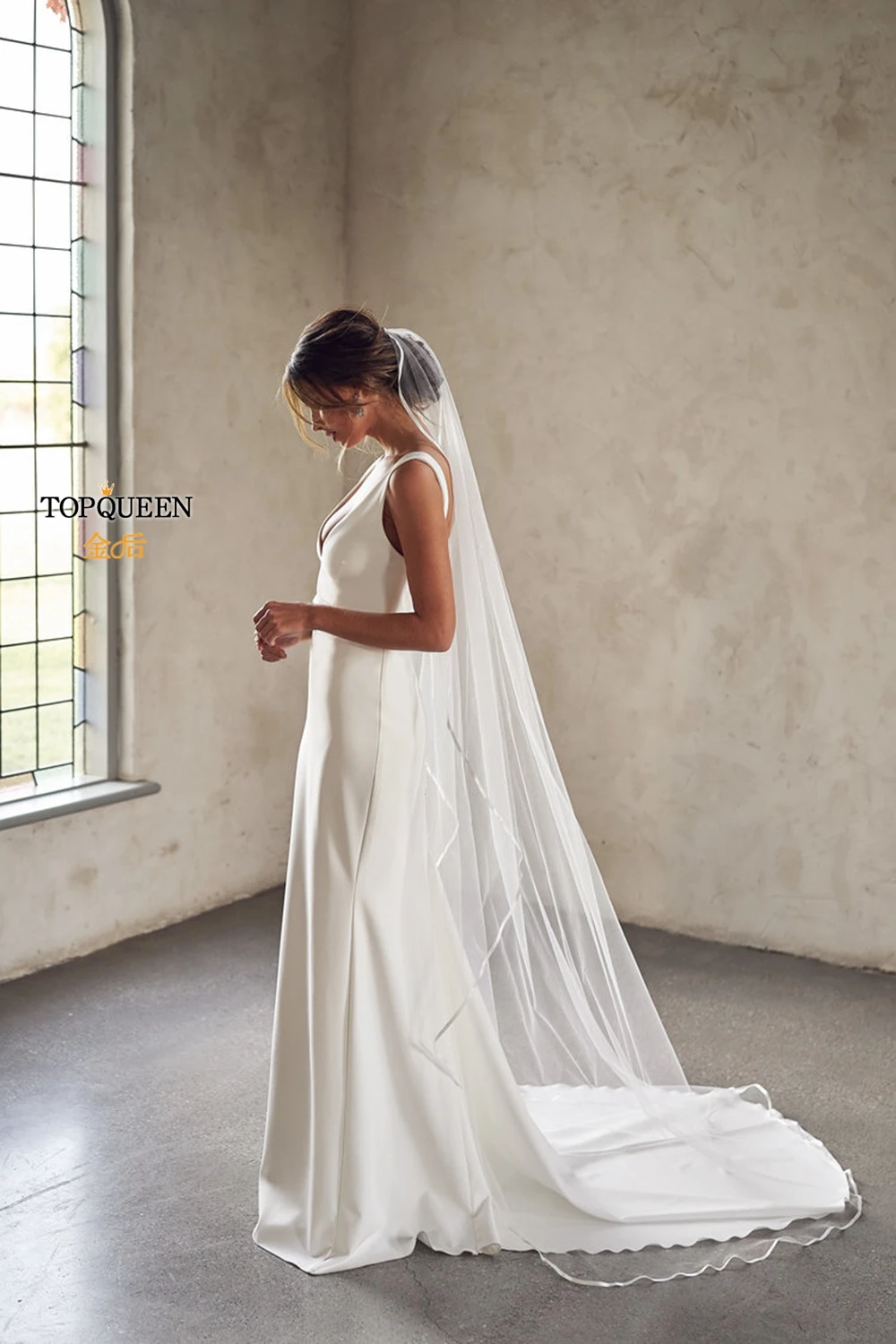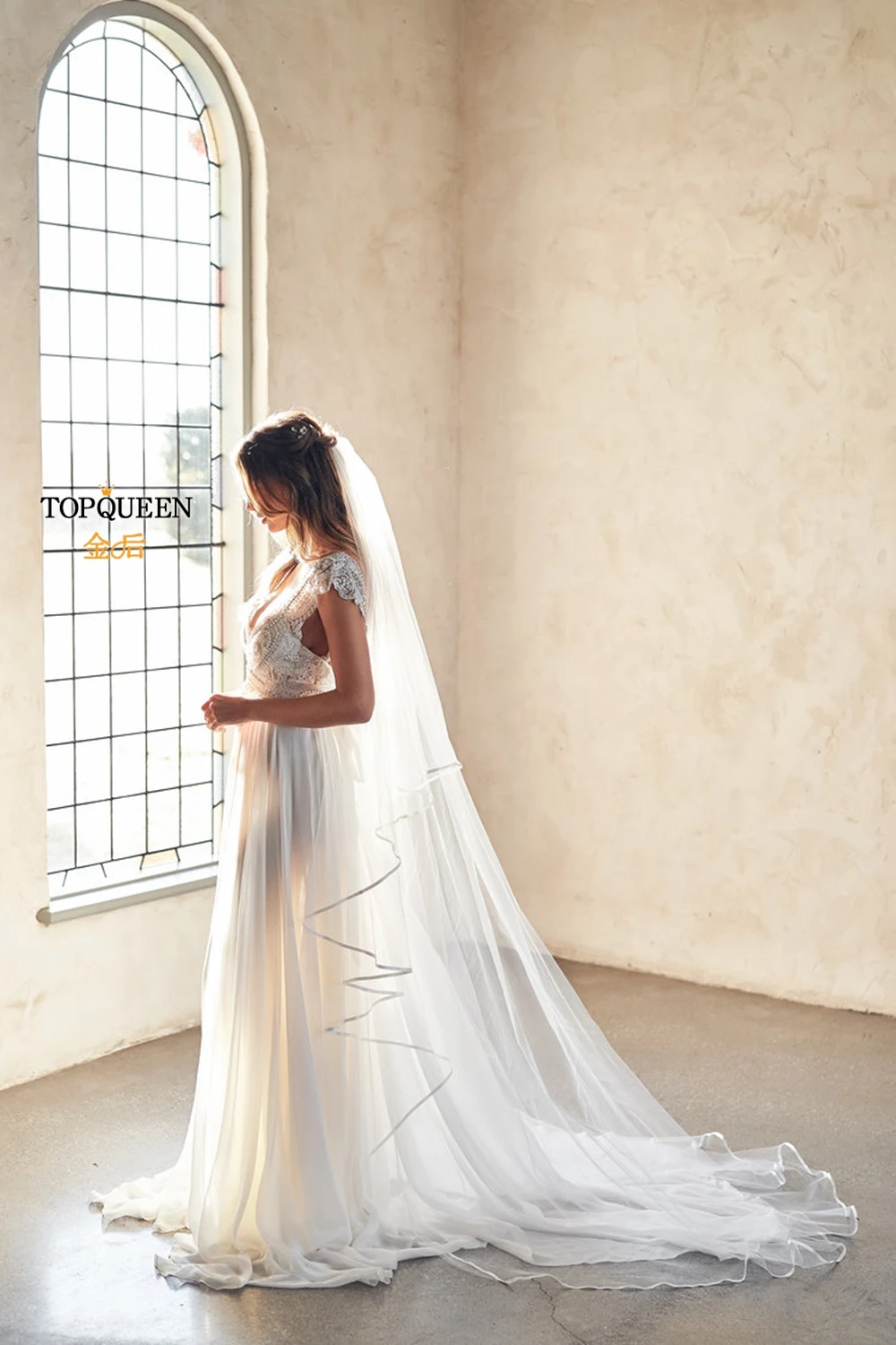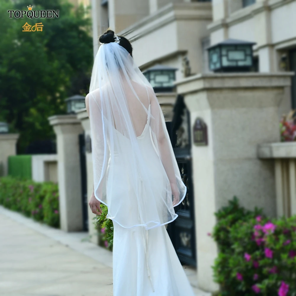 Фата свадебная TOPQUEEN V21 с ленточным краем, мягкая Тюлевая с шелковыми краями, одноуровневая прозрачная, швейцарская вуаль для невесты