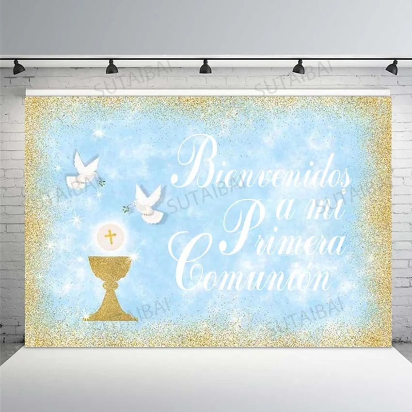 Мое Первое причастие для девочек украшения фон для фотосъемки с изображением крещения синего цвета для мальчиков на заказ Виниловый фон для фотосъемки в Mi Bautizo Baby Shower фон
