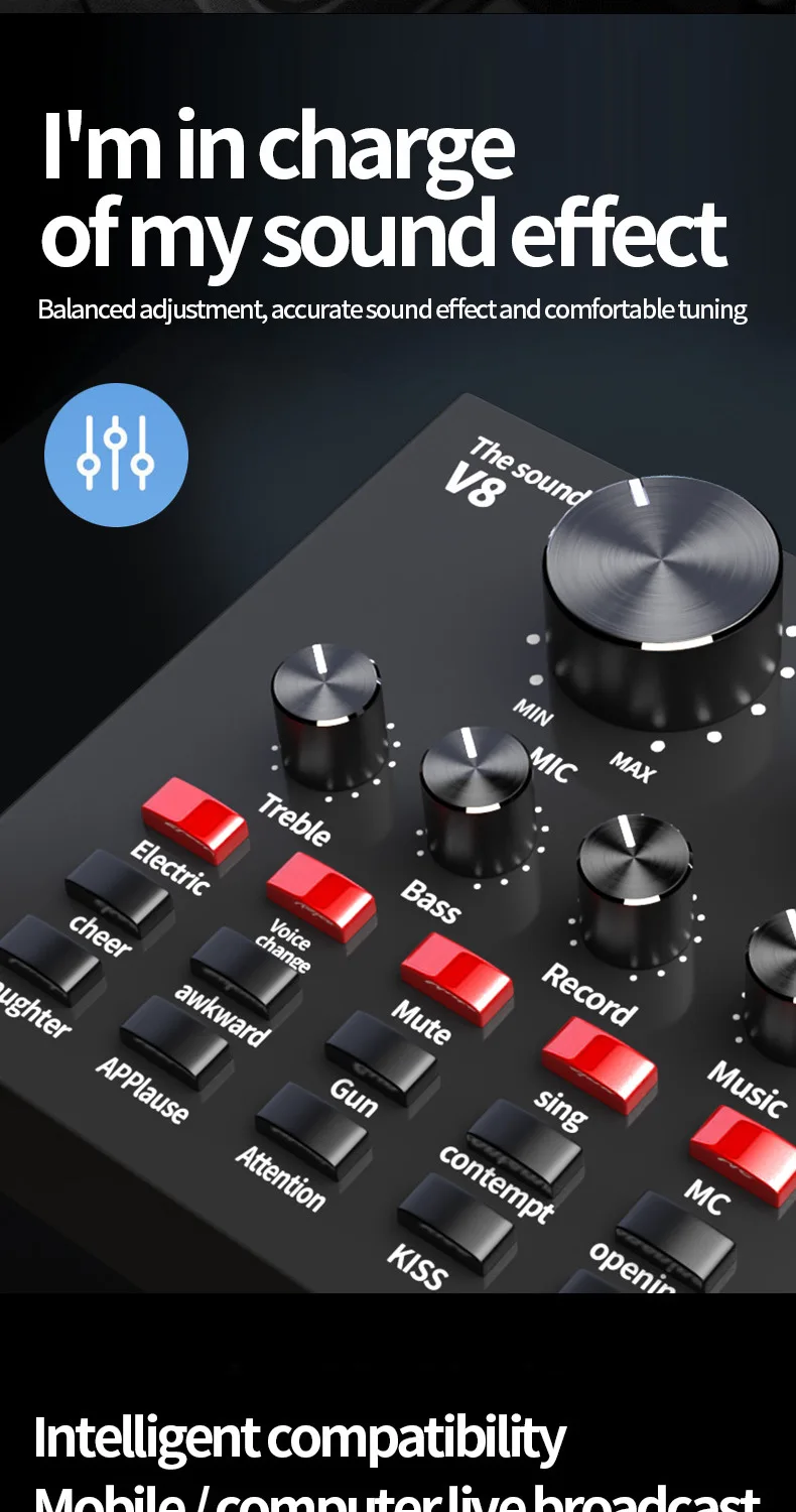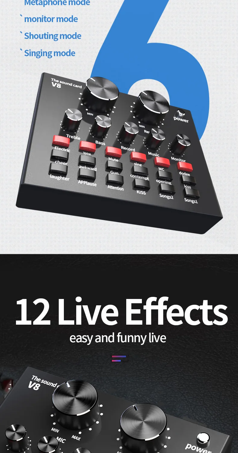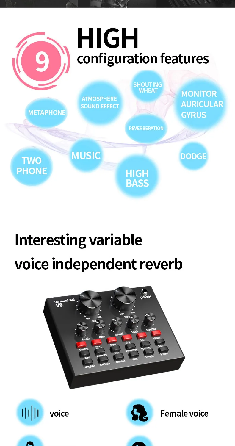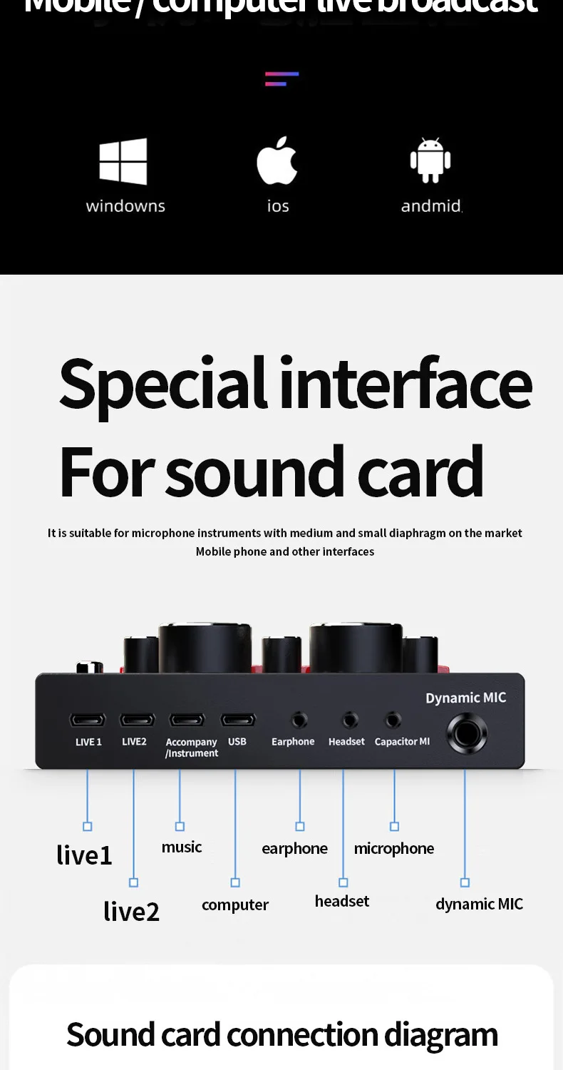 Характеристика:1. 112 видов электрического звука, 18 видов звуковых эффектов, 6 видов режимов эффекта.2. Регулировка размера реверберации, регулировка громкости микрофона, высокая регулировка басов, управление громкостью записи, управление громкостью музыки, контроль громкости (функция наушников).3. Поддерживает мобильный телефон, компьютер, поддерживает использование одной гарнитуры.4. 7 видов способов подключения: один мобильный телефон K song live, двойной мобильный телефон live, три мобильный телефон live, мобильный телефон синхронный live, один компьютер live, компьютерное сопровождение сотовый телефон live, инструмент ввода сотового телефона live.5. Функция BluetoothУпаковочный лист1 звуковая карта2 аудиокабеля1 х USB кабельРуководство пользователя на английском языке-1 шт.