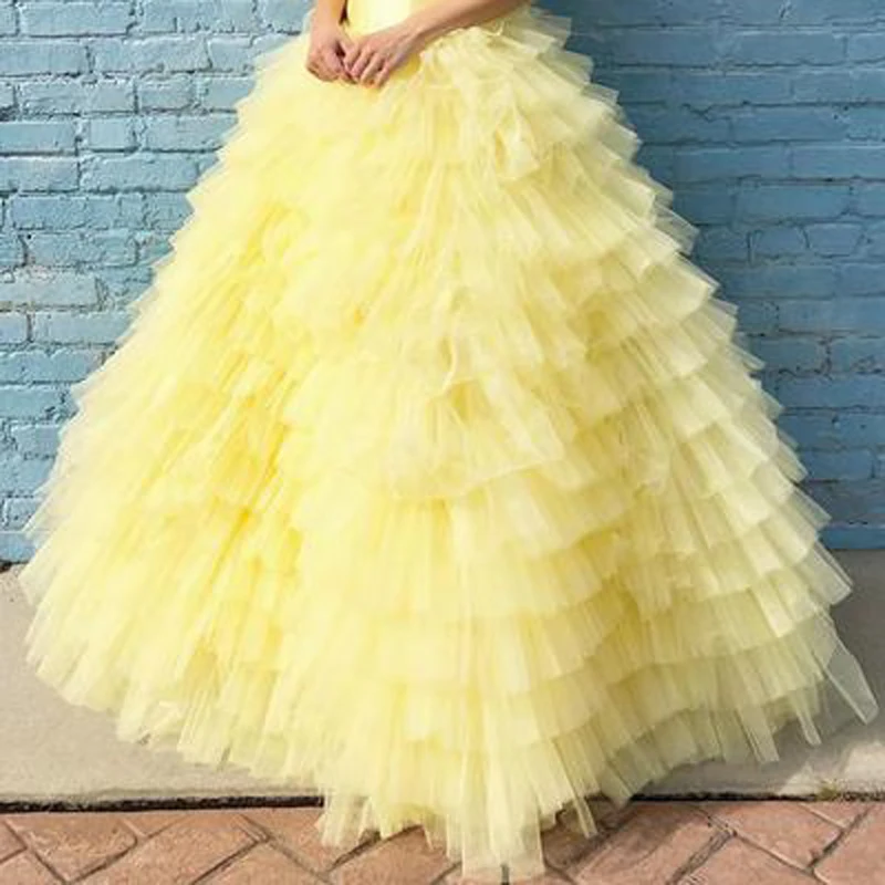 Красивые пышные желтые Многоуровневое Свадебная пачка юбки 2021 оборками Паффи этаж Длина длинные Для женщин Тюлевая юбка эластичные индивидуальный заказ