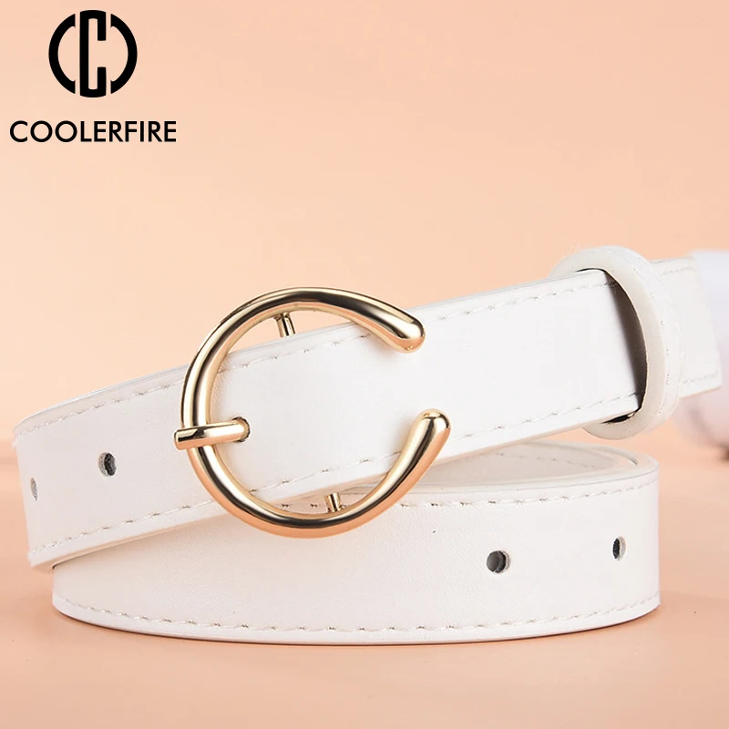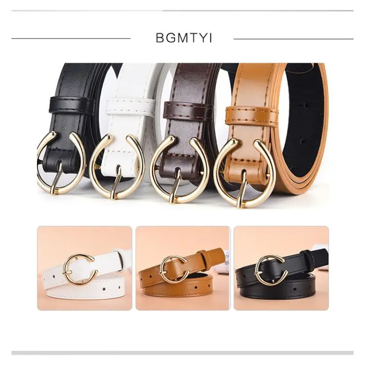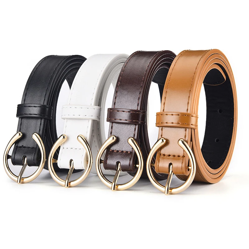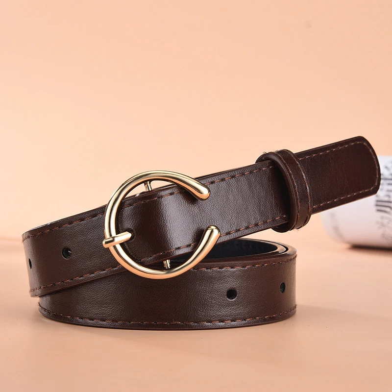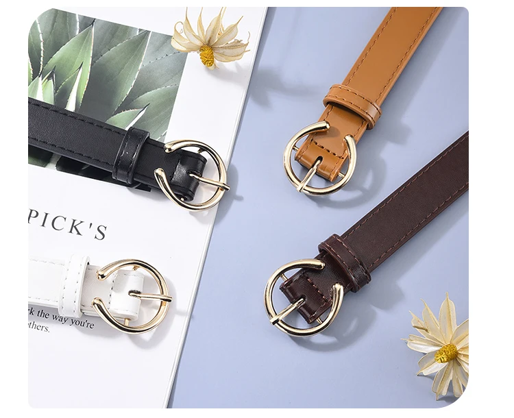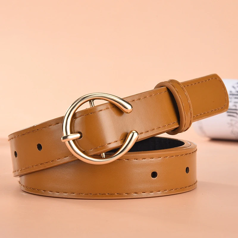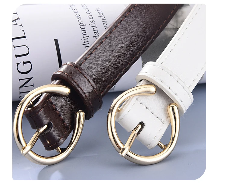 Ремень женский кожаный с круглой золотистой пряжкой, AL025