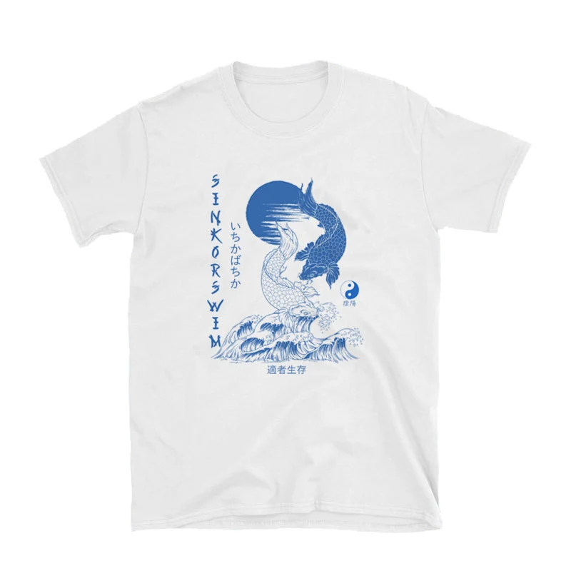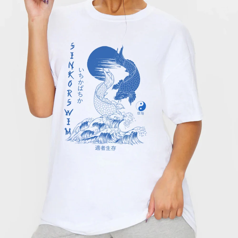 Футболка женская в японском стиле с рисунком рыбы кои, винтажная размера плюс уличная одежда в стиле Харадзюку, изображение Инь Янь, эстетическая одежда