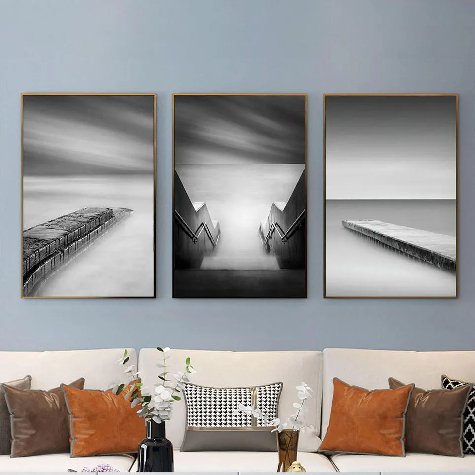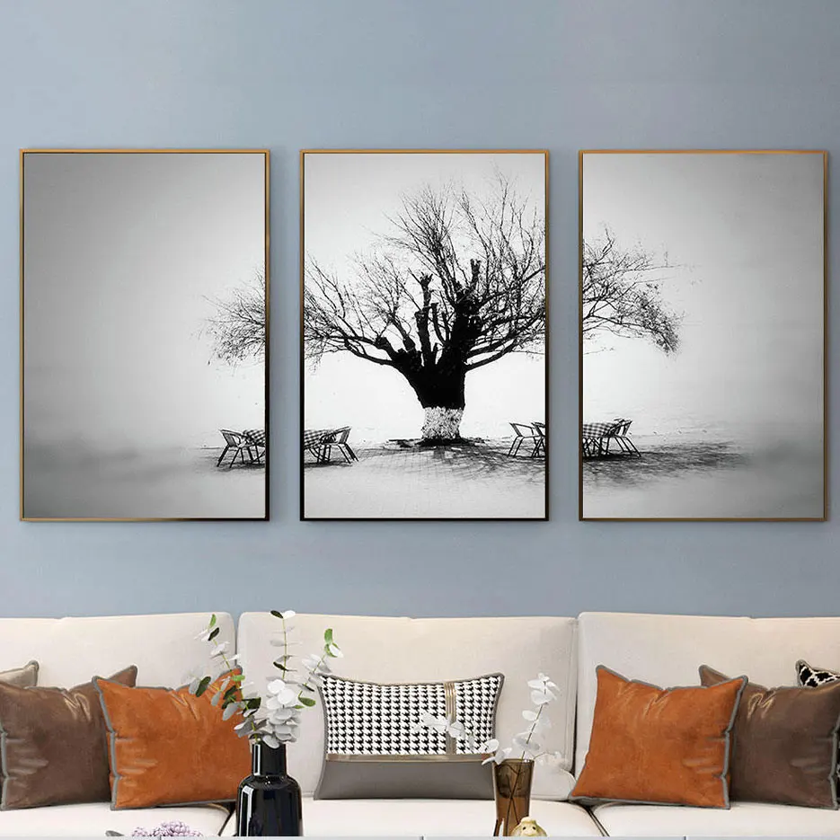 Комплект из 3 предметов, современный черно-белый пейзаж, фотографии, плакаты с деревом и принтами, мостик, холст, картина, настенная живопись для гостиной
