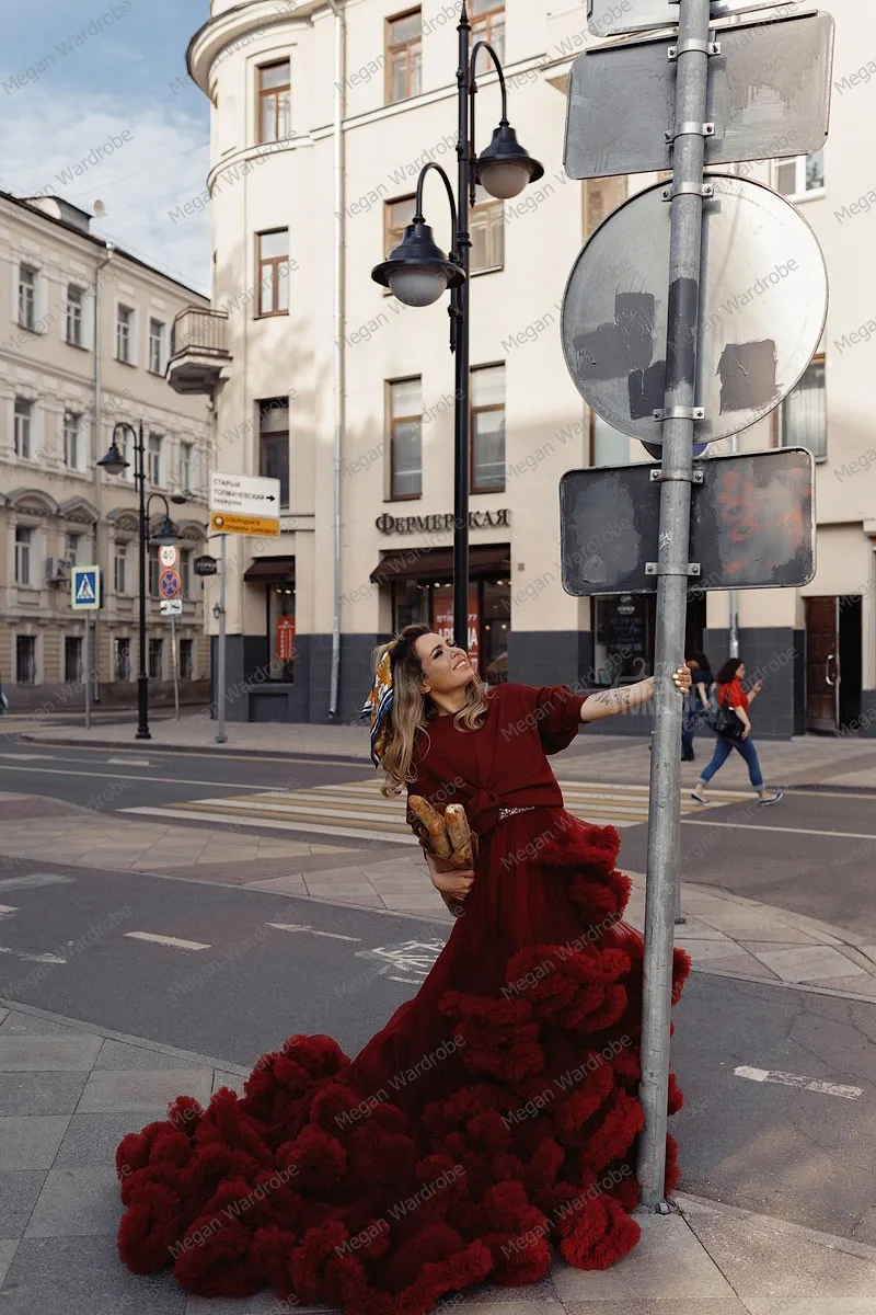 Женская плиссированная юбка со шлейфом, бордовая фатиновая юбка с оборками, для фотосессии