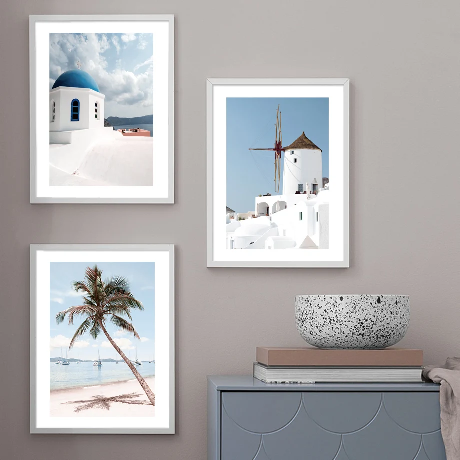 Санторини Эгейское море пляж Кокосовое Дерево Маяк настенный художественный Принт Холст Картина скандинавский плакат Декор картинки для гостиной