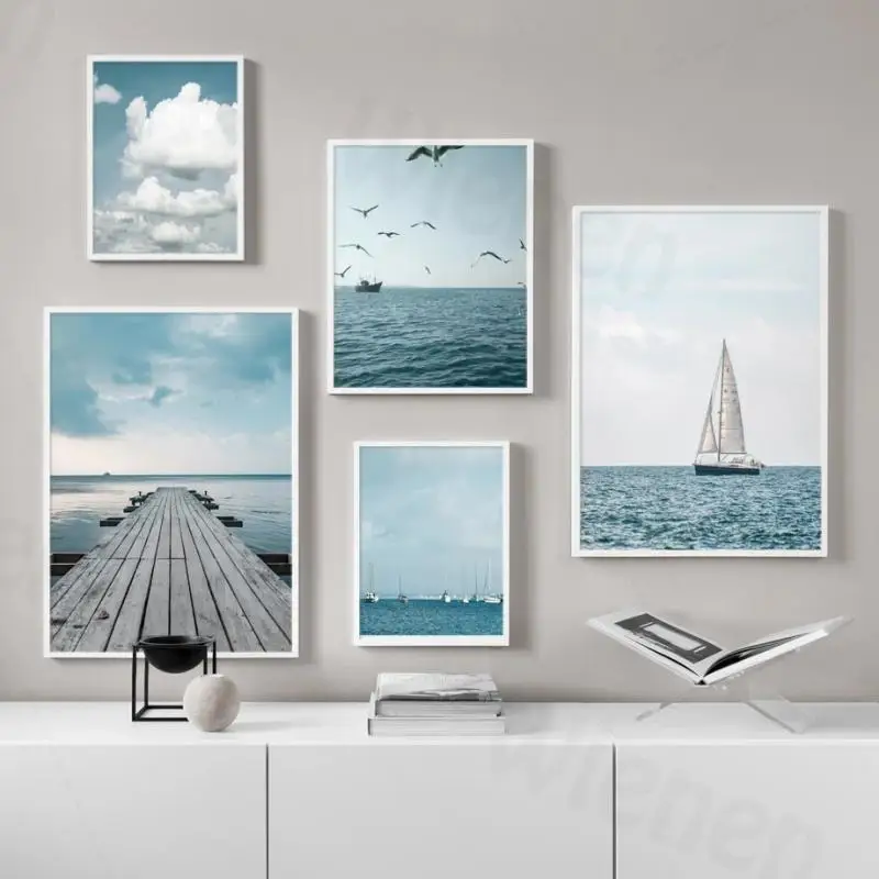 Современная картина для домашнего декора, голубое небо, белые облака, океан, парусная яхта, маяк, морской пейзаж, холст, постер, настенное искусство, картина для комнаты