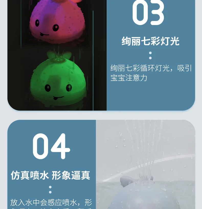 Мигающий Красочный светильник и распыление захватывающих фонтанов, которые приносят бесконечные Развлечения для детской ванны, легко привлекают внимание ваших детей, забавная игрушка для ванны, чтобы соблазнить вашего ребенка принимать ванны.