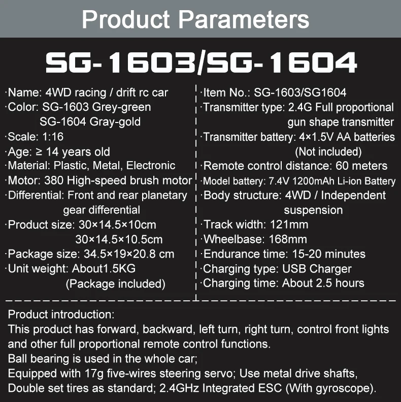 Модель гоночного автомобиля SG1603 1604 116 2,4G 4WD с электроприводом 30 кмч светодиодный светильник кой