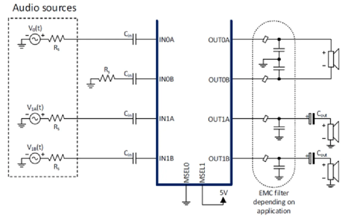 Положение1/Положение2 = 0/1 :2Одноканальный выход (SE)+ 1Выход канала полумоста (BTL), В это время выходная мощность каждого канала составляет 040 Вт, Выходная мощность полумоста80 ВтМетод подключения показан на рисунке ниже: