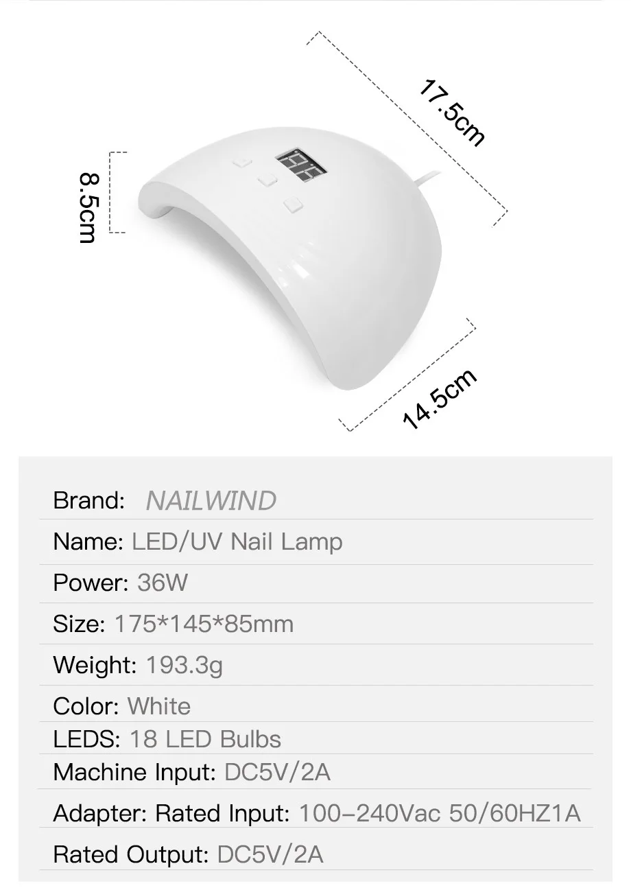 Характеристики Товара:Бренд: NAILWINDНазвание: светодиодный/УФ-лампа для ногтейМощность: 36 ВтРазмер: 175*145*85 ммЦвет: белыйСветодиодный S: 18 светодиодный лампыВход машины: DC5V/2AАдаптер: Номинальный Вход: 100-240Vac 50/60HZ1AНоминальная мощность: DC5V/2AПеро:1. Солнечный свет2. Не вреден3. Не черные4. Может быстро отверждать УФ-гель/строитель/светодиодный гель.5,18 шт стратегически расположенных светодиодов, без мертвых зон, более бесплатно.Шаг за шагом:1. Включение питания.2. Нажмите на режим синхронизации, который вам нужен, 30s, 60s или 90s.3. Инфракрасные датчики активируют лампу сразу же, когда вы вставляете руку.4. Подождите несколько минут, и он высохнет.5. Лампа будет выключена, когда вы вытащите руку.Примечание:1. Не используйте кислотную liqiud для очистки чипов, иначе это приведет к потере обесцвечивания чипов.2. Лечение в течение 2-3 минут.