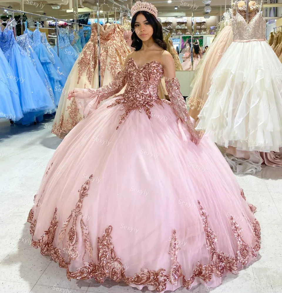 Платье принцессы с блестками для 16-дневного вечера, пыльное Розовое Бальное Платье, блестящее платье для выпускного вечера с длинным рукавом, 15 дней рождения