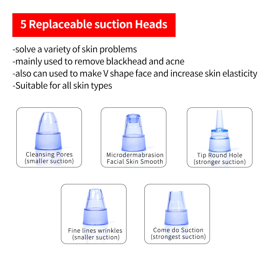 Может использоваться для удаления черных точек, акне и глубокой очистки лица и подходит для лечения сухой кожи, обвисания кожи, тусклой кожи, а также морщин, увеличения кровообращения в кожеВакуумная функция очищает грязные поры через всасывание и увеличивает кровообращение в кожеПоставляется с 5 сменными косметическими головками, которые могут предложить различные функции и предложить более глубокую очистку для вашей кожи лицаРегулируемое всасывание с множеством уровней делает его подходящим для разной кожиПомогает удалить поры, черные точки, морщины на лице и сохранить вашу кожу чистой, делая кожу гладкой для омоложения
