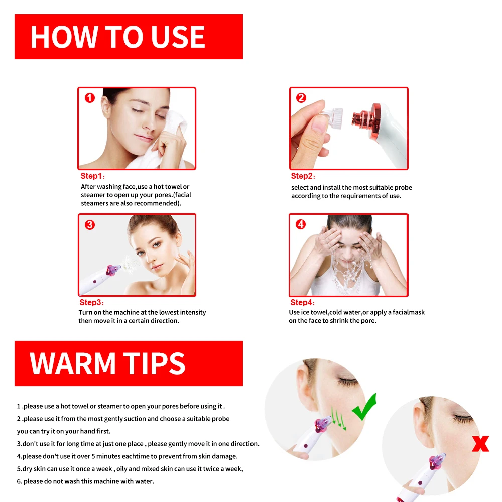1. Нанесите горячее полотенце или черные точки на кожу лица, держите его 5-10 минут, откройте поры и смягчите кожу;2. Выберите нужный вам наконечник и установите наконечник на основной блок;3, медленно двигаясь по коже лица, пожалуйста, не оставайтесь в одном положении слишком долго, чтобы избежать кожи красного и фиолетового цвета;4. После очистки Вымойте холодной водой, нанесите маску, правильно Используйте смягчающие средства, сохраните лицо увлажненным