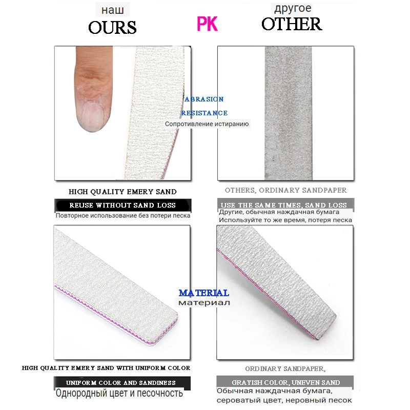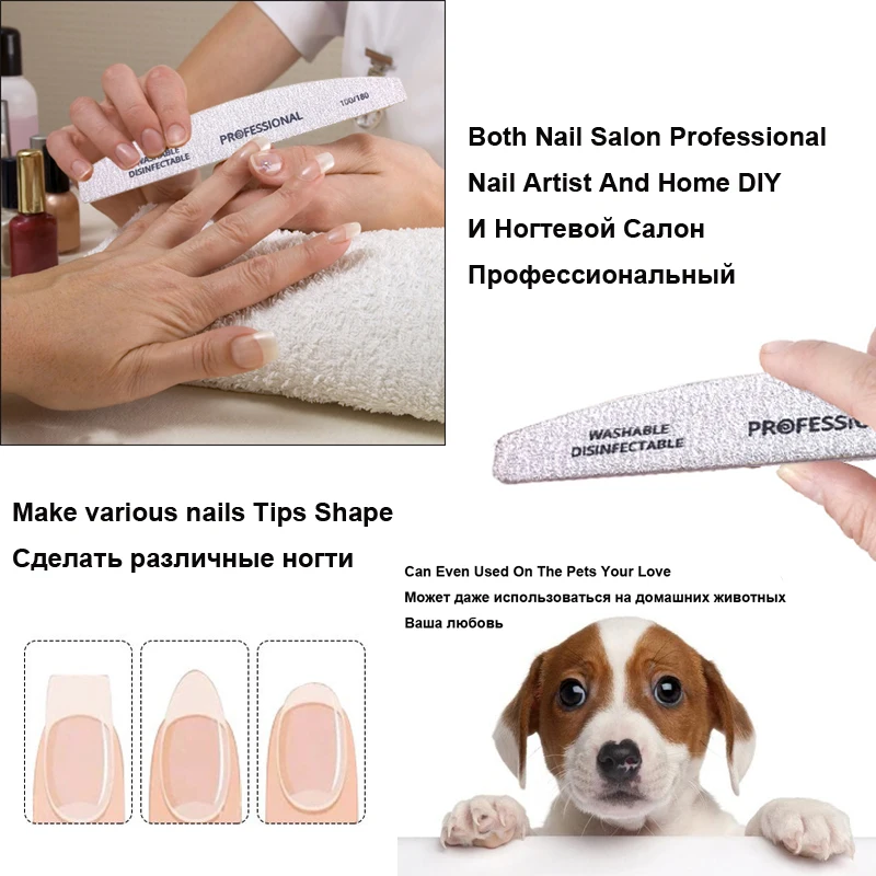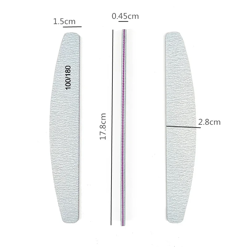 • Материал:Пилочки для ногтей серого цвета, двусторонние, моющиеся, одноразовые, зернистость 100/180; Зернистость 100 для искусственных ногтей, зернистость 180 для натуральных ногтей. Пилочки для ногтей всегда будут красивыми во время путешествий, так как они компактны и помещаются в кармане. Пусть ваши ногти сияют в любом месте в любое время.