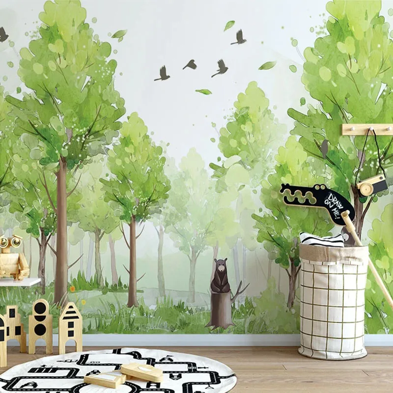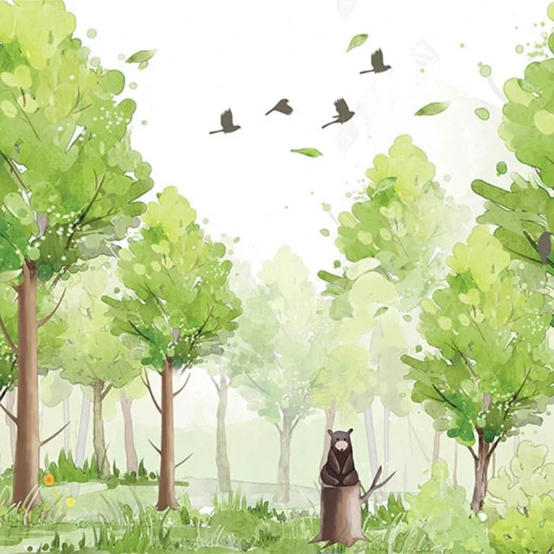 Фотообои на заказ 3D Ручная роспись лес зеленое дерево птица мультфильм медведь настенная живопись детская спальня Детский сад Фреска