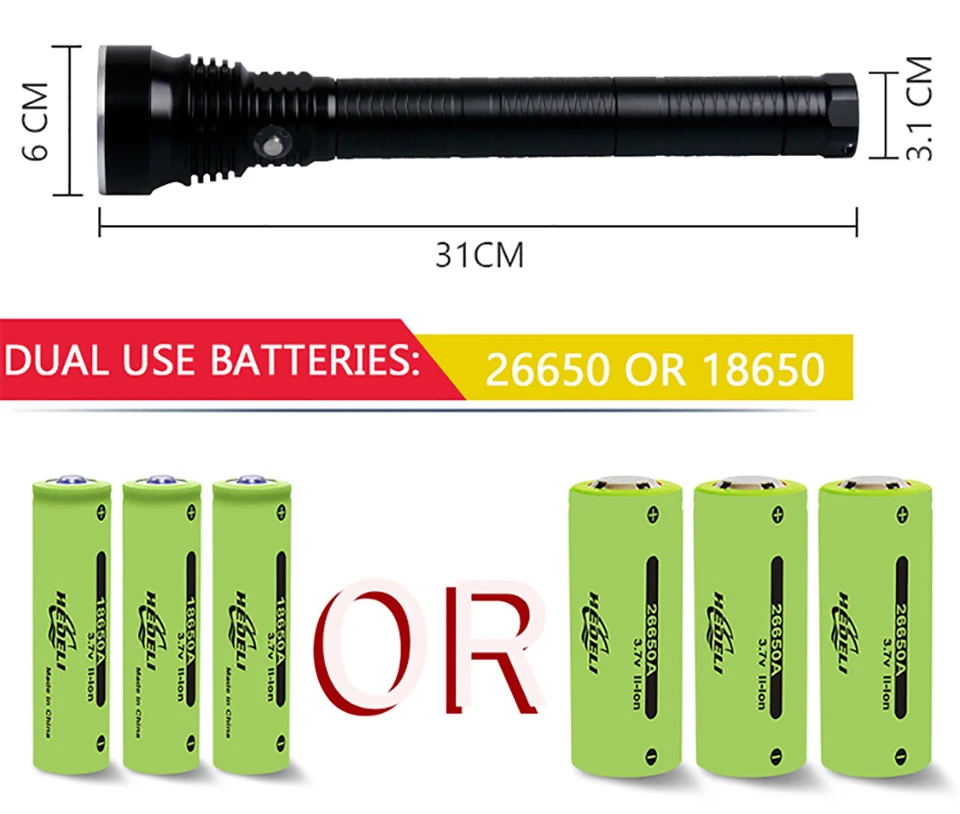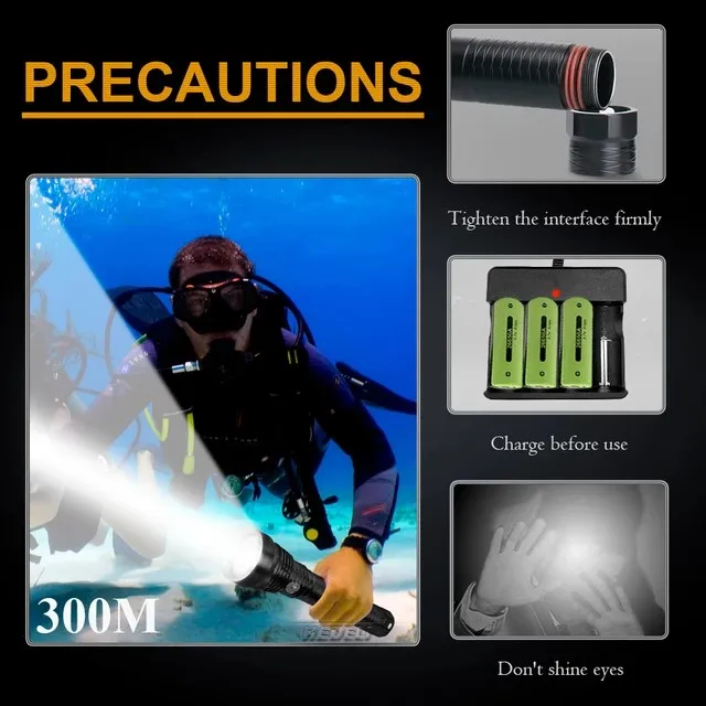 Бренд: PAWEINUOФитиль фонаря: XHP50.2 / XHP70.2 / XHP90.3Размер: 24,3*6,1*3,3 смДиапазон погружения: 300-400 мРежим переключения: 4 режима (высокий, средний, низкий, SOS, мигающий)Материал корпуса: алюминиевый сплавСтепень водонепроницаемости: IPX8Источник питания: 3*18650 или 3*26650 батареи (2x18650 или 2x26650 также обеспечивают правильную работу продукта)Время освещения: аккумулятор 18650 3-4 часа; Аккумулятор 26650: 6-8 часов.Цвет свечения: светильник/желтый светильник
