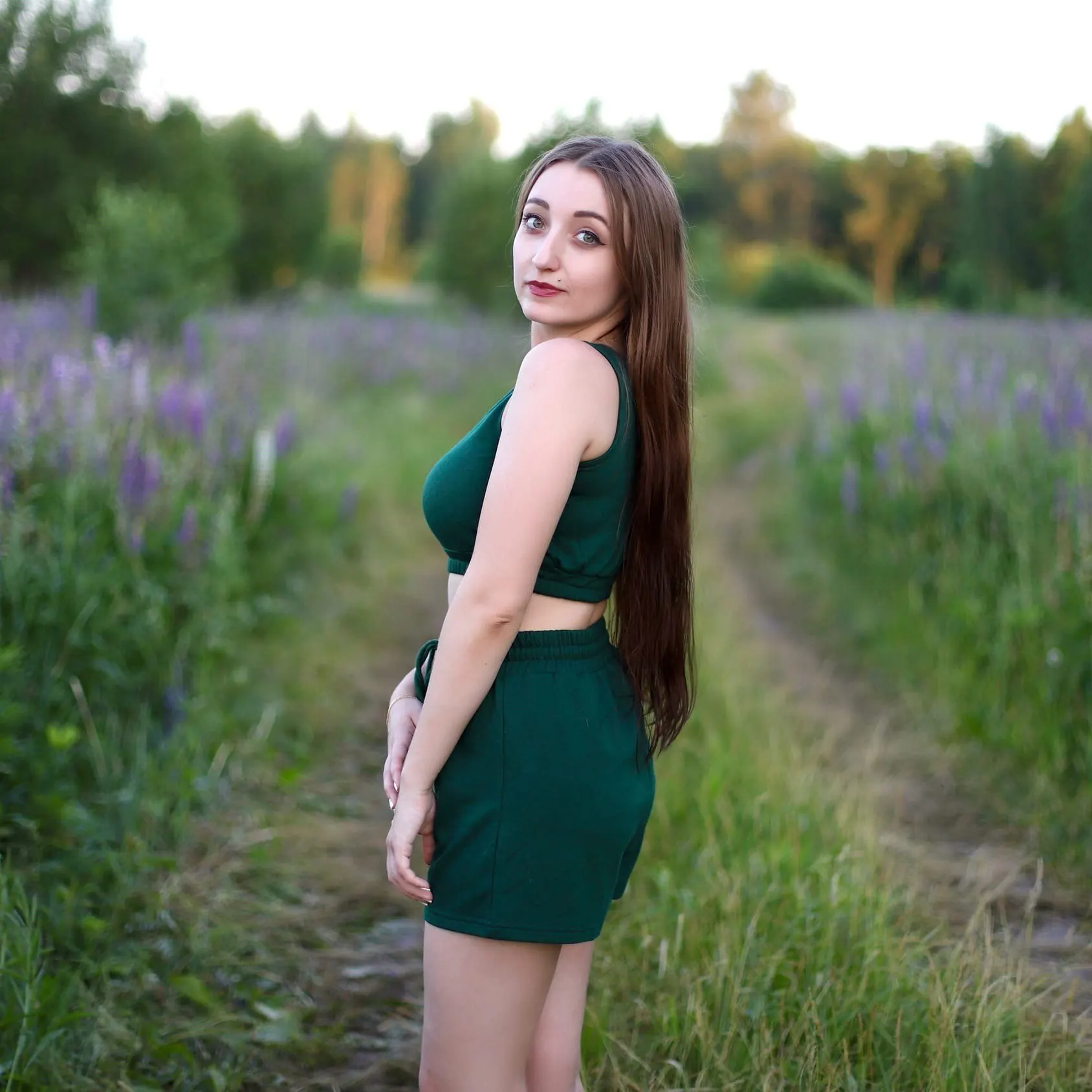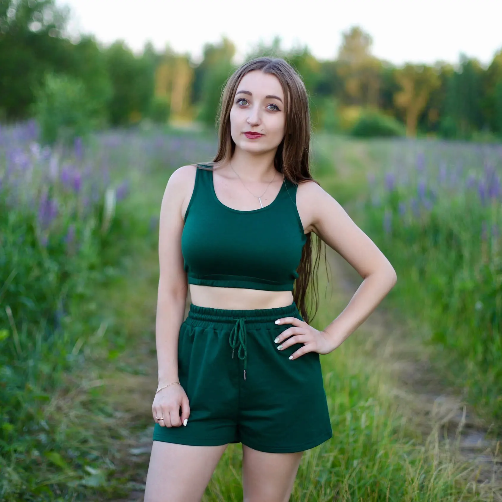 Хороший костюм на лето Брала размер М на параметры 86 63 90 рост 158 см, ощущается неплохой запас и в топе и в шортах. Материал похож на смесь хлопка и синтетики, мягкий, комфортный, на лето на каждый день супер. Материал тянется хорошо, мнётся не сильно. Белье лучше бесшовное, так как ткань хоть и плотная, но тонкая. В темном цвете не просвечивает. На большую грудь без белья топ не подойдёт, держать грудь не будет Видео в Inst @ksukorneeva