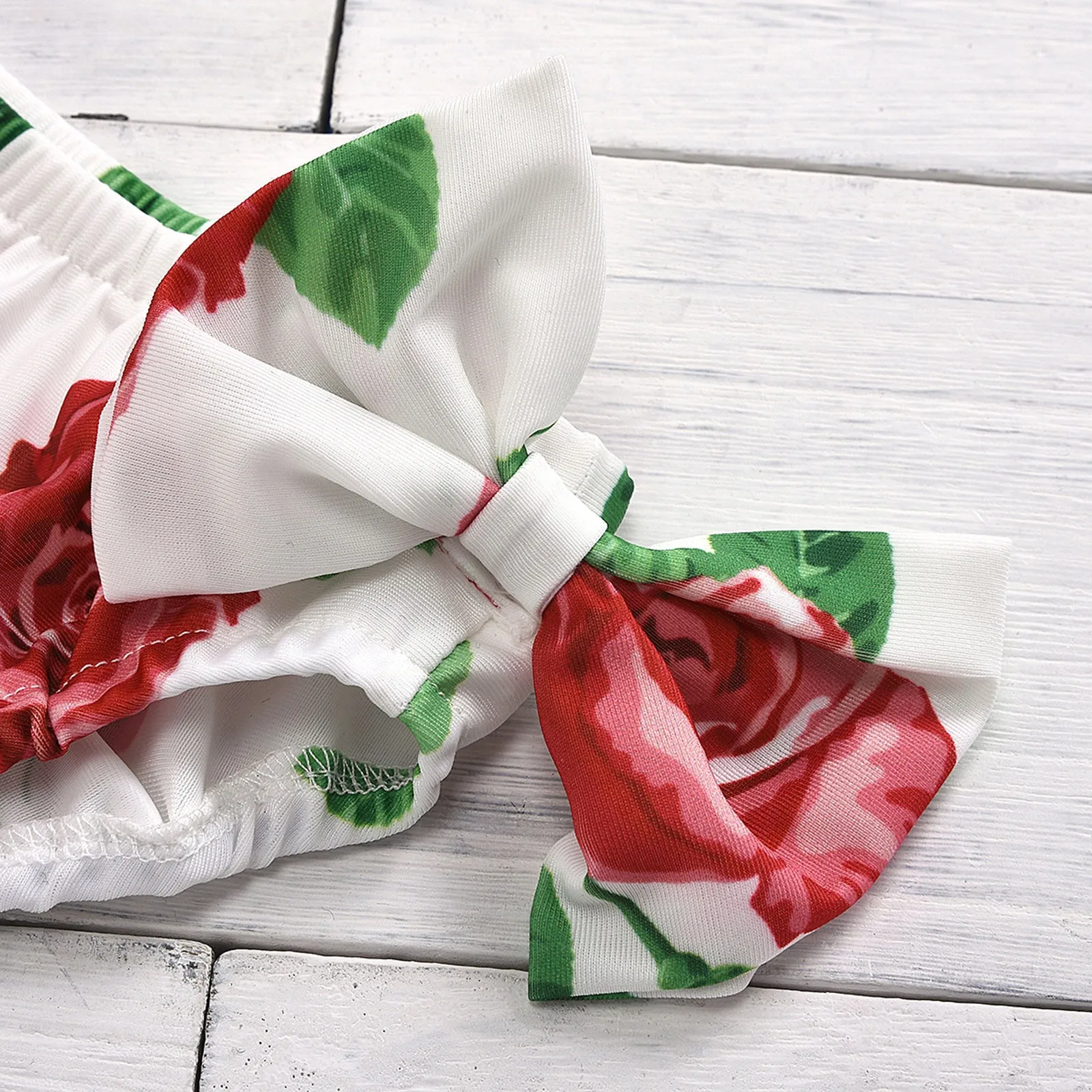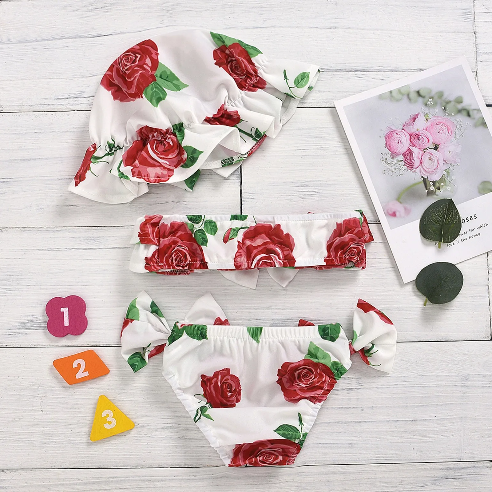 Летний купальник с цветочным принтом для маленьких девочек, топ, шорты, шляпа, комплект одежды