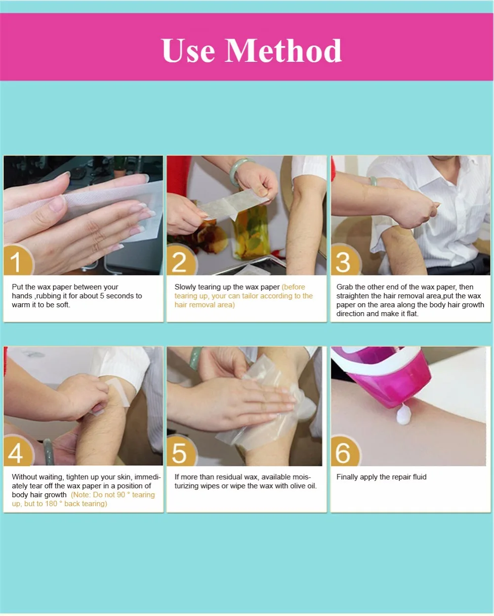 4. Не дожидаясь, подтяните кожу, немедленно Оторвите вощеную бумагу в положении роста волос на теле (Примечание: Не разрывайте на 90 °, а разрывайте на 180 ° назад)