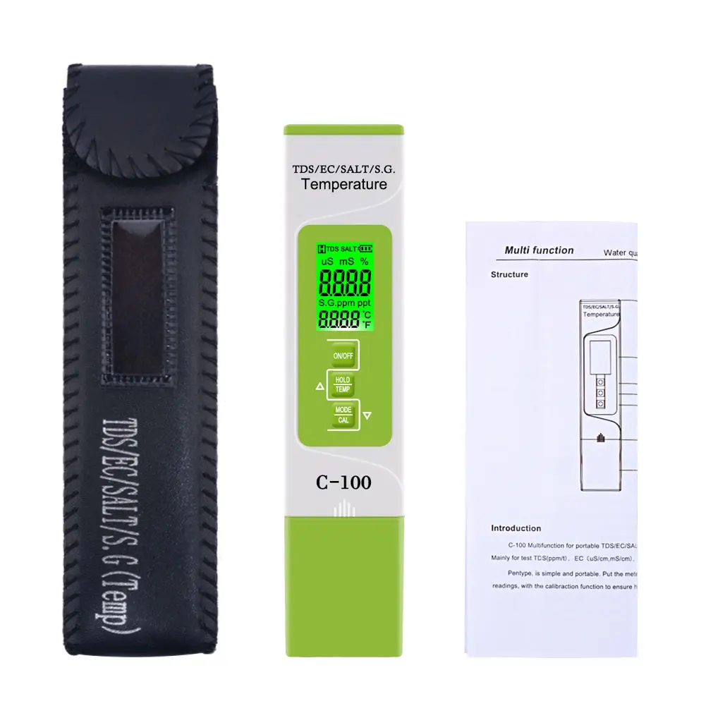 C-100-новый многофункциональный прибор для проверки качества воды, который может измерять температуру, EC, соленость S.G и температуру. Диапазон измерения большой и широкий, который может измерять как соленость пресной воды, так и морскую соль, это потрясающий цифровой тестер качества воды для дома, бассейнов, питьевой воды, аквариумов