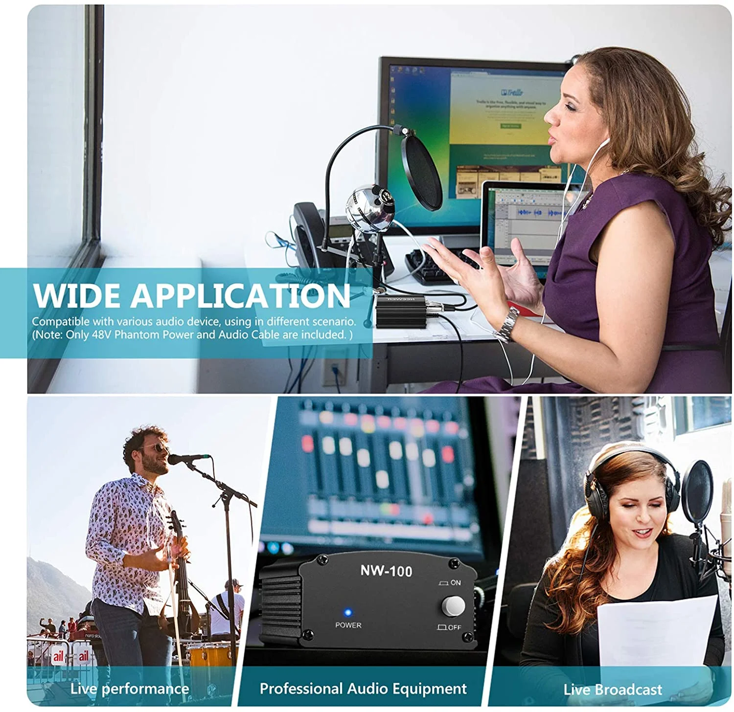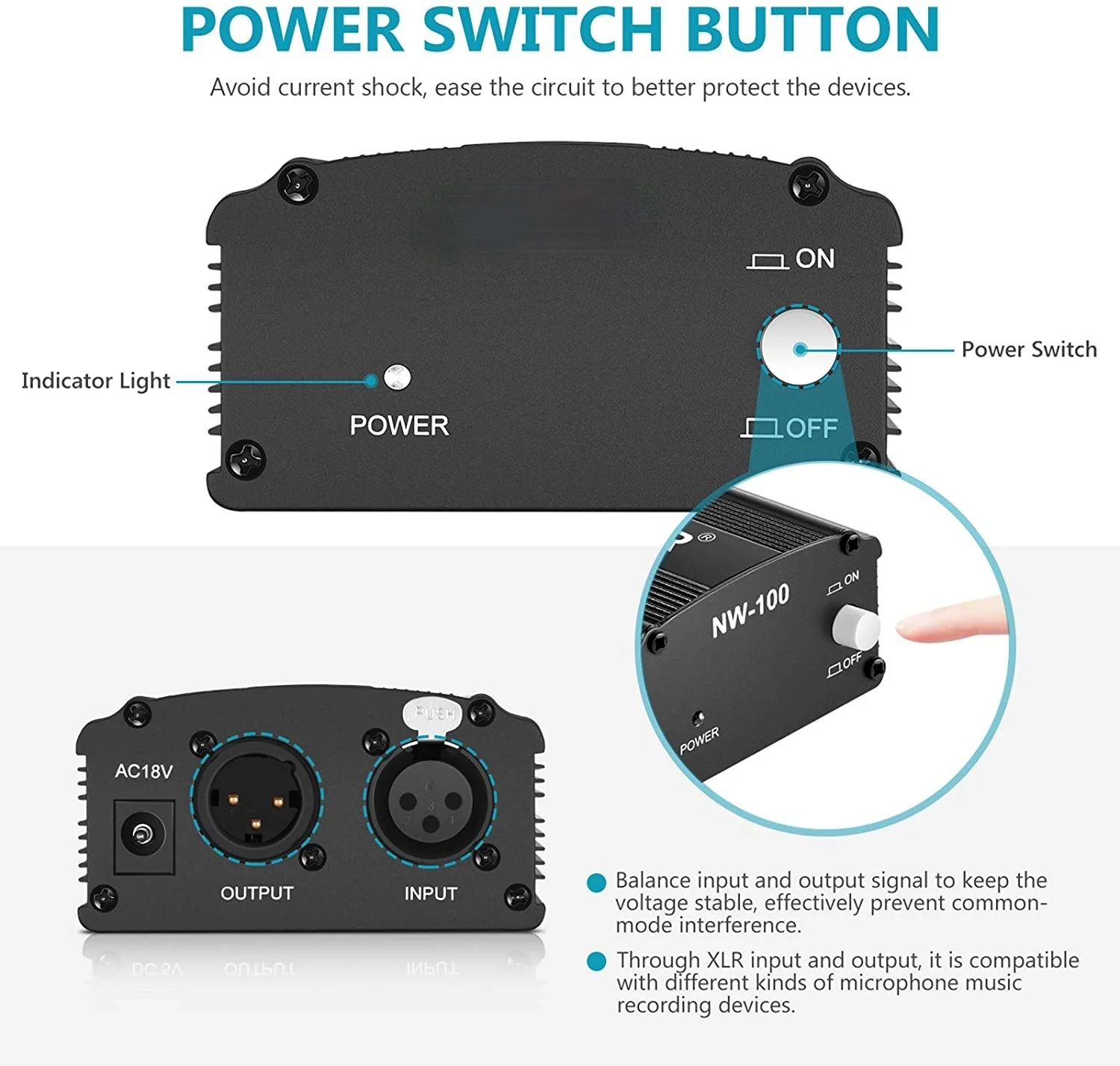 Обеспечивает надежное 48В для конденсаторных микрофонов и передачу звукового сигнала звуковая карта в компактный, прочный, пластиковый корпус. Универсальный вход и выход XLR, совместим со всеми видами оборудования для записи музыки с микрофоном. Поставляется с одним аудиокабелем XLR с высококачественными разъемами XLR для мужчин и женщин. Новая усовершенствованная технология, работающая от usb-кабеля, дает наилучшие результаты без необходимости найти розетку. Оснащен одноканальным блоком со сбалансированными входами и выходами для подключения в линии с микрофоном и миксером. Включение/выключение выключателя питания и светодиодный индикатор для удобства работы. В комплект входит один адаптер. Простой в использовании и идеально подходит для сценического и студийного использования. Примечание: Phantom power обеспечивает напряжение 48 В для конденсаторного микрофона, но phantom power не улучшает качество звука микрофона и улучшает Нормальный объем. Входное напряжение: 110-220 В. Микрофон в комплект не входит.Посылка в комплекте 1 х 48V Phantom Питание 1 х 2,5 м кабель XLR 1 х адаптер ЕС или США Посылка в комплекте 1 х 48V Phantom Питание 1 х 2,5 м кабель XLR 1x usb кабель