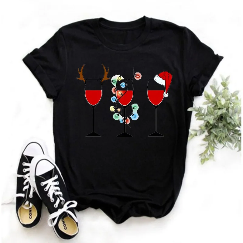 Футболка женская короткая с принтом бокала вина, Рождественский узор, круглый вырез, короткий рукав, повседневная одежда