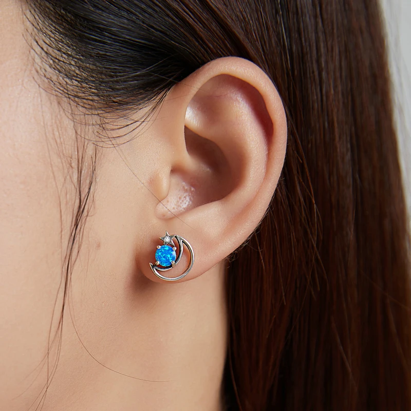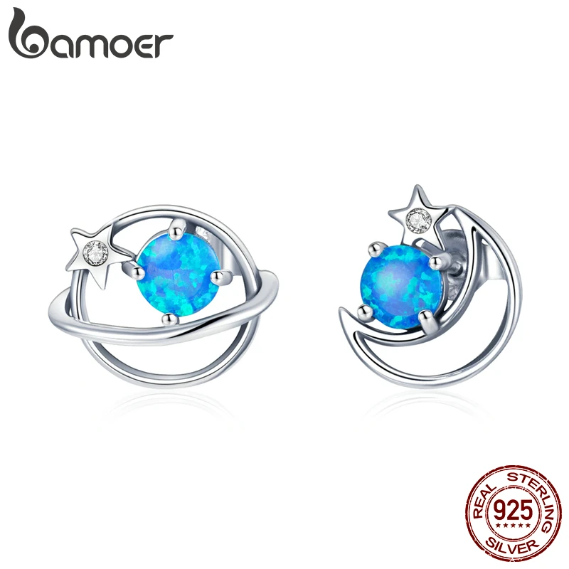 Женские серьги-гвоздики bamoer, из серебра 925 пробы, с таинственной планетой, голубым опалом, Луной и звездой, ювелирные украшения, SCE1133