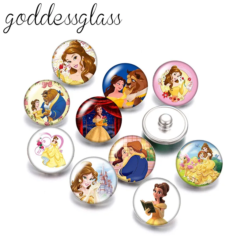 Красавица и с рисунком из мультфильма Красавица и Чудовище платье принцессы Белль 10 шт. круглый фото стекло 18 мм кнопки для 18 мм Оснастки браслеты ювелирные изделия оптом