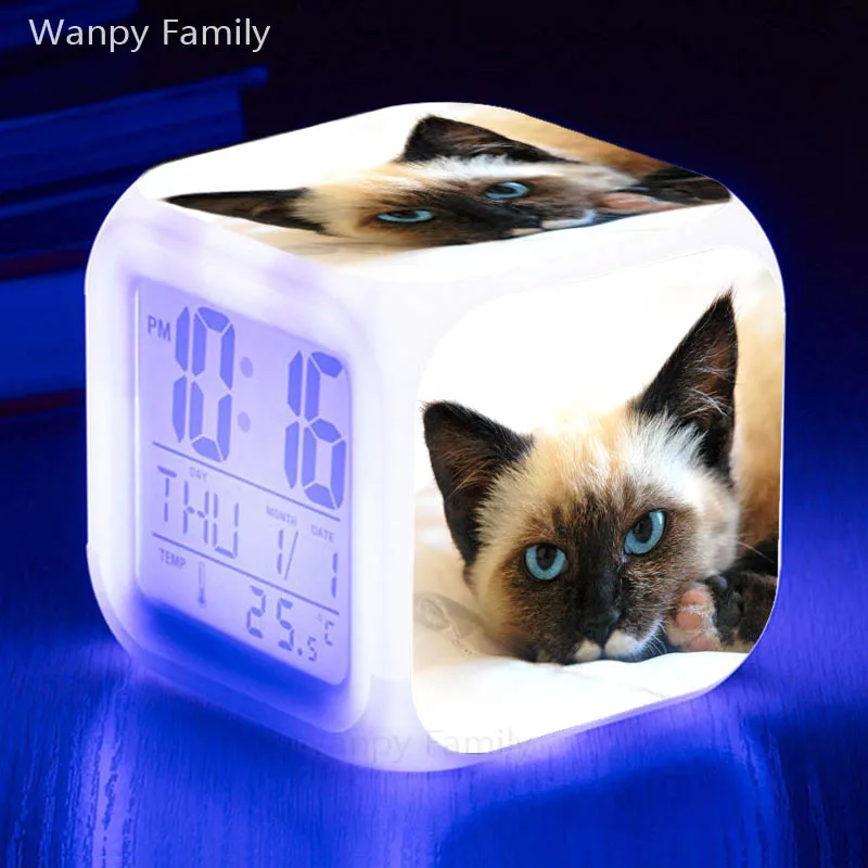 Симпатичный кот Будильник 7 цветов Светящиеся СВЕТОДИОДНЫЕ цифровые...