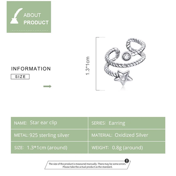 ❤【Note】 это одна штука/серьга ❤【Description】A простой и стильный зажим для ушной кости, украшенный в форме звезды. Комплект состоит из сверкающего циркона и не преувеличен для повседневной носки. ❤【Спецификация 】размер: 1,3*1 см, вес: 0,8 г ❤【Материал】 серебро 925 пробы и ПАВЕ, CZ и окисленное серебро, эти серьги не имеют никеля, не содержит свинца, не содержит кадмия, гипоаллергенны. Гарантия качества, приятный для кожи, удобный и удобный в носке, не вредный для вашего здоровья. ❤【На подарок 】 1 пара сережек и 1 шт. Изысканная Подарочная коробка, которая является идеальным подарком для мамы, дочки, правки, тети, сестер, друзей. ❤【BAMOER YOU】 чтобы обеспечить ваше полное удовлетворение, любые вопросы о продукции BAMOER, просто не стесняйтесь обращаться к нам, мы постараемся сделать все возможное, чтобы помочь вам.