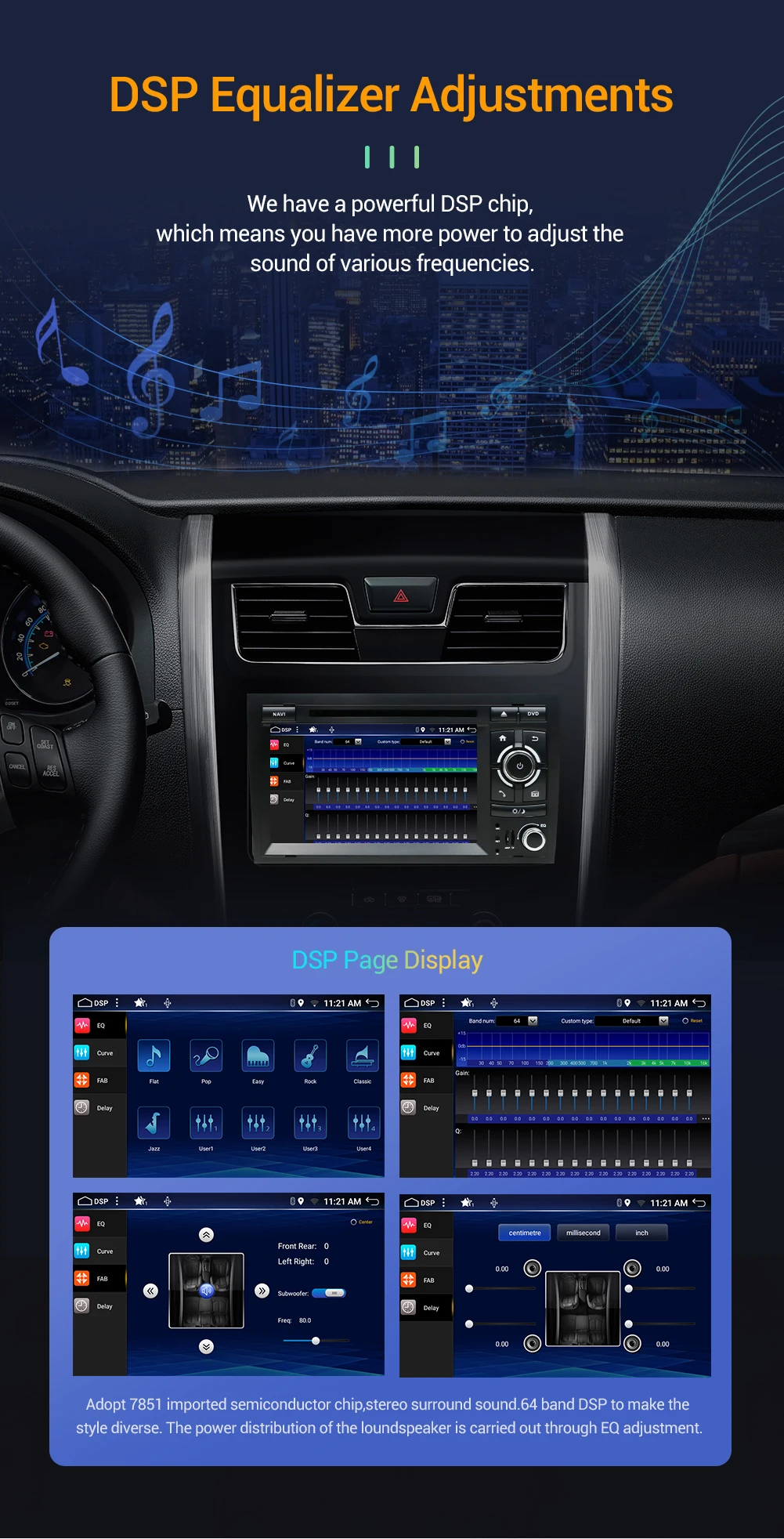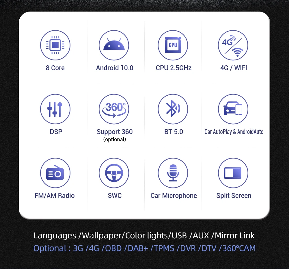 DSP + Carplay + сенсорный экран + радио + FM/AM + RDS + gps-навигация + карта + Wifi + Bluetooth + управление рулевым колесом + сплит-экран + USB + SD + AUX in/Out + зеркальная ссылка + камера заднего вида + сабвуфер + Play Sore + эквалайзер + набор обоев + логотип автомобиля + 3G/4G + TPMS + DAB + OBD 2 + DVR + TV