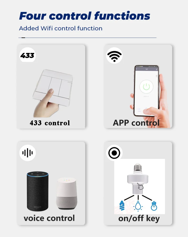 【WiFi + 433 】 wifi подключение, вы можете дистанционно управлять через мобильный телефон APP + Голосовое управление динамиком. 433 функции, вы можете купить 433 свободно липкая панель самостоятельно, вы можете управлять одной и той же лампой в разных местах дома.