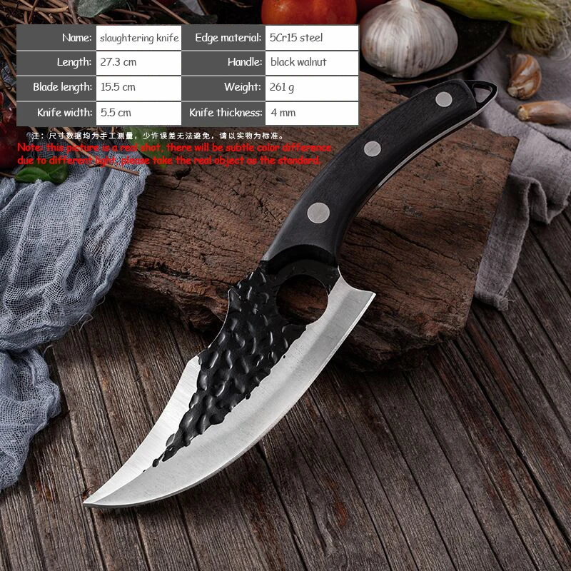 6 "Черная рукоятка из ореха Мясник ножДлина: 27,3 смДлина лезвия: 15,5 смШирина лезвия: 5,5 смТолщина лезвия: 4 ммМатериал лезвия: сталь 5Cr15Твердость: 58-60HRC