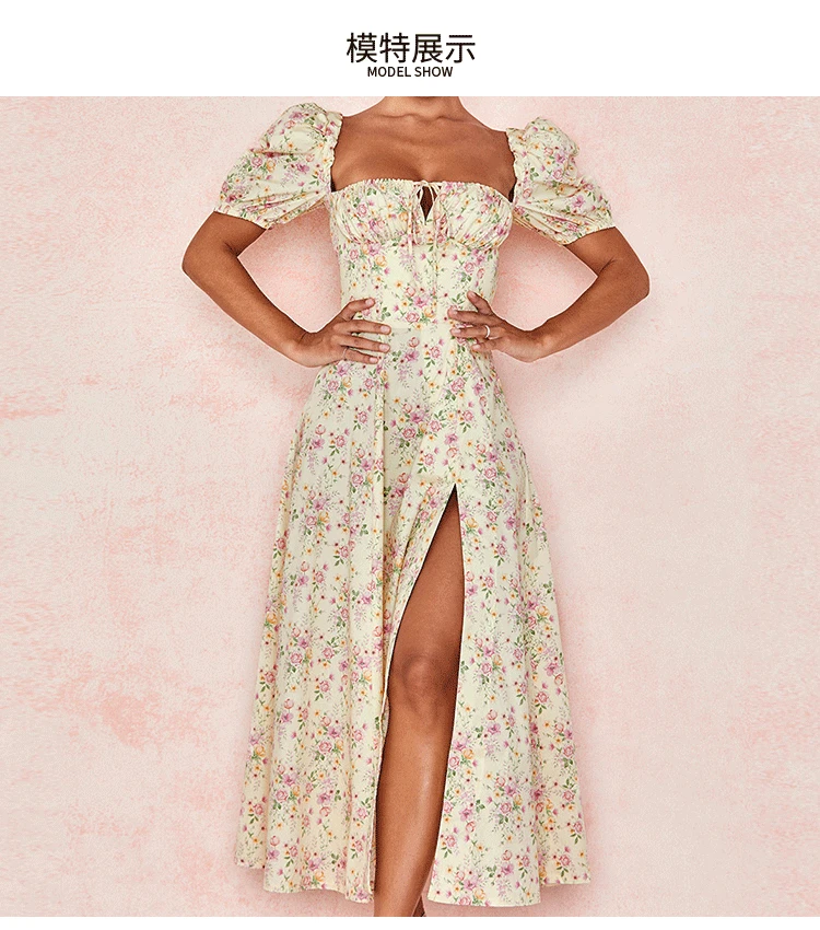 Женское длинное вечерние нее платье, летнее платье с коротким пышным рукавом, с цветочным принтом, с высоким разрезом и рюшами, пикантный сарафан на завязках, 2021