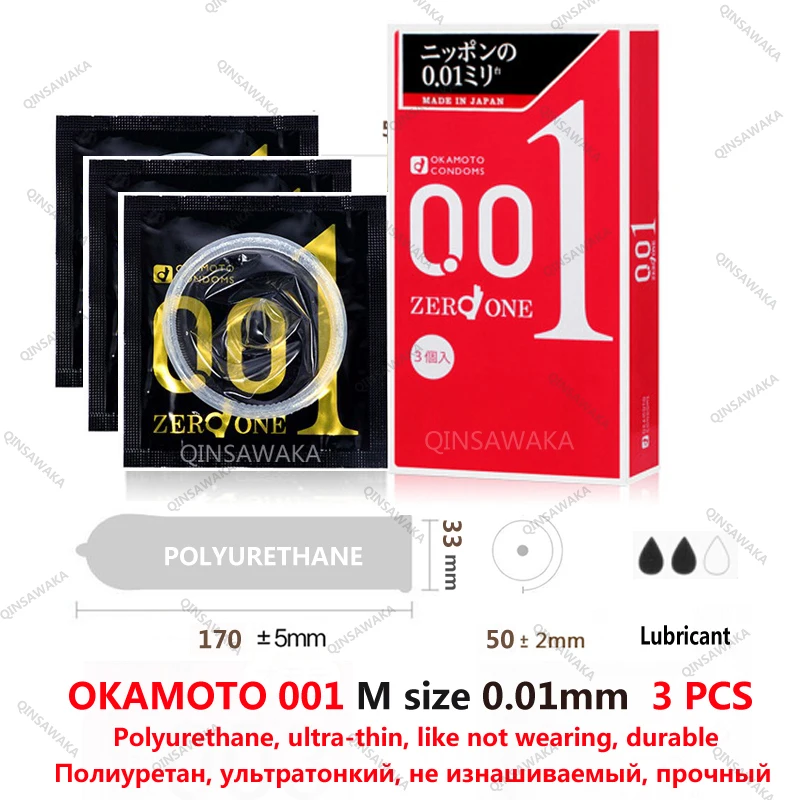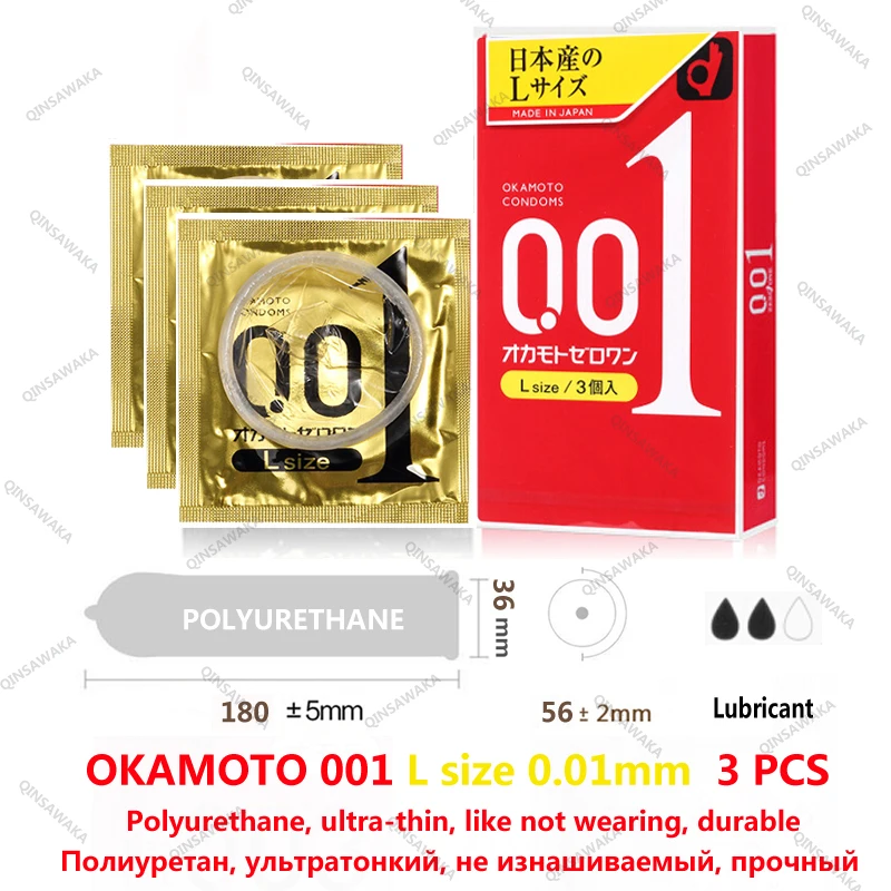 Бренд: OkamotoТовар: 001 ультратонкийМесто происхождения: Япония, сделано в ЯпонииМатериал: полиуретан, не латексГарантия: высокое качествоРазмер:Толщина: 0,01 мм, 0,02 ммРазмер M: 170(+-5) мм, диаметр: 32 мм, 50(+-2) ммРазмер L: 180(+-5) мм, Диаметр: 36 мм, 56(+-2) ммПосылка: